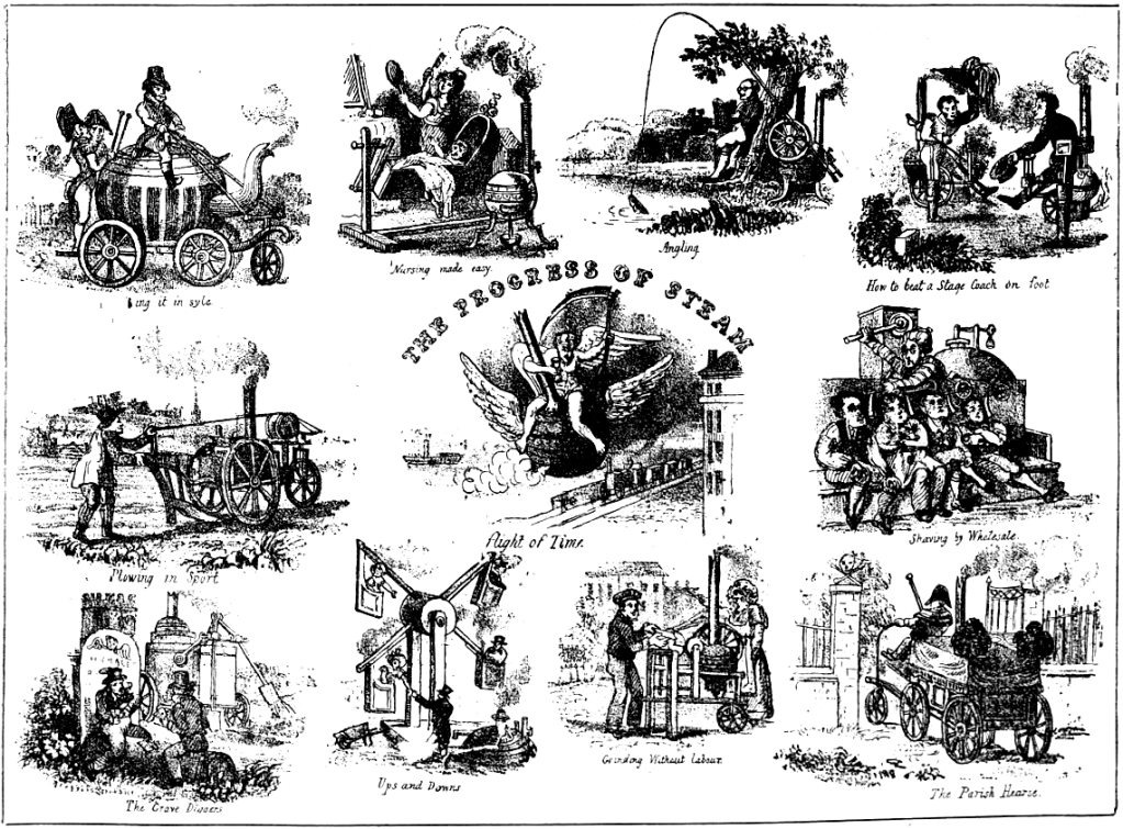 TWO YEARS BEFORE the first railway Blackwood’s Magazine looked to the future: “The most novel application of that most powerful of all agents, Steam, is now coming before the public in a form which at least promises practical effects. Gurney, an ingenious chemist and mechanician, has, after various attempts and failures, brought his steam carriage into a state allowing of actual experiment on the road. It some time since ran up Highgate Hill, a very steep ascent, at the rate of probably ten miles an hour; but its descent was more formidably rapid, for the pilot (better word than chauffeur, that!) was unable to guide its velocity, and it tore off one of its wheels. To be run away with by a horse of this kind, that would think nothing of whirling carriage, passengers, and all, into the third heavens, or dissolving them to a jelly in the face of mankind, was too perilous an adventure to be assured of popularity. In the meantime another engineer sent another steam carriage to perambulate the streets, but his name was the most disastrous imaginable for the purpose. An old Roman would have pronounced him destined by Fate never to prosper in steam apparatus, for the name was Burstall. The omen was true, for the carriage blew up, and boiled and parboiled several scientific spectators, doing at the same time the good work of washing the faces of the mob far and wide…But this machine has one grand defect, that the steamery is under the feet of the passengers…Where the journey may end, whether at Bristol or in the other world, is the problem…The engineer protests, by all the names of philosophy, that a blow up is utterly impossible. But in the modern philosophy the most impossible things have come to pass so often that a man attached to his own vertebrae may well be allowed to indulge a little scepticism…The machine will never be entitled to popularity, until the chance of blowing up is entirely out of the question; which it can scarcely be while the steam engine forms a part of the carriage. It must be detached, and at some distance from the carriage, and be not a steam coach, but a steam horse…and to this construction the machine will naturally come…Where we obtain a new power over Nature, we have a new source of national wealth; and no matter what it may displace for the moment [such as the huge industry surrounding horse powered transport], we are sure that it will replace the loss by ten times, or a thousand times, the gain.”