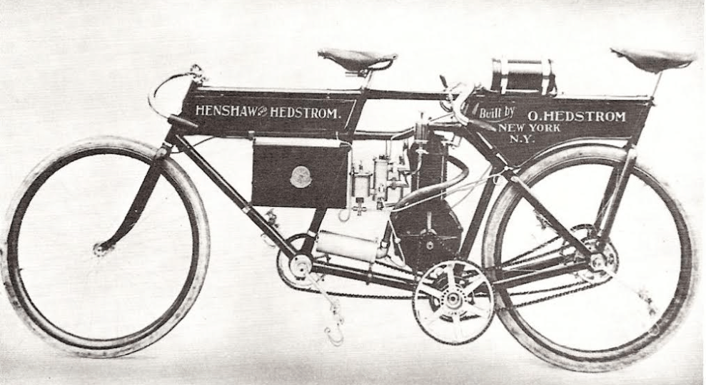 A DOZEN ‘MOTOCYCLES’ WERE AMONG the exhibits at the 10th bicycle show to be held at Madison Square Garden, New York. The Bicycling World expected to see “the good old pedal pushed bicycle reach out its crank to its newly found brother, the gasolene goer, and exclaim, ‘Shake!’And it reported: “There arrived at the Show on Wednesday a motor bicycle made by E Hefelinger, Town of Union, NJ, and it is no exaggeration to say that it created a sensation. In the centre of a diamond frame bicycle is built in—in the place of the usual seat post mast—a frame of small tubing to take the motor. Ordinarily this method of attaching it would be attended with many disadvantages, but so compact is the Hefelfinger motor that it does not interfere with the rider or the mechanism of the bicycle in any way. The drive is a chain, running on two nearly equal sized sprocket wheels, and connected with both the crank shaft of the motor and the pedals, so that either or both can drive. In the crank hanger is a clutch designed to throw the pedals out of gear when they are not driving. A two-speed gear is fitted to the rear hub. The carburetter is placed back of the saddle and the battery is contained in a long cylinder, which is affixed to the lower frame tube. The flanges for cooling the motor run vertically instead of around the cylinder, as usual…It is very plain that the disposal of the motor is the chief problem awaiting a solution at the hands of motor bicycle designers and makers.”