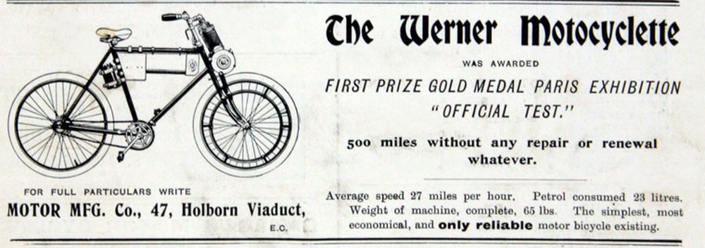 WERNER SALES passed 1,000 but De Dion was the world’s biggest manufacturer of vehicle engines, producing 3,200 by year’s end with power outputs up to 2¾hp. In time De Dion engines would propel up to 150 makes of car, trike and motorcycle. A complete De Dion trike weighed in at about 200lb; yours for £50.