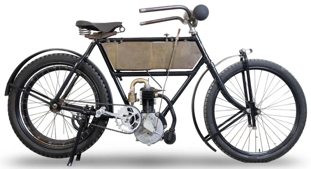 “THE MOTOR CYCLE has been developing in France almost concurrently with the automobile. By 1895 there were several on the market, the first in date being the Millet with four cylinders revolving round the rear hub. Then came the Dalifol steam bicycle, which ran with wonderful smoothness; but the system was not altogether conducive to the comfort of the rider, whose feet rested on the furnace, and the chimney, into which he occasionally dropped pieces of coke, rose conveniently above the top tube right under his nose, while he had to stop every few miles to replenish the water tank…Mr HO Duncan introduced that equally wonderful Hildebrand and Wolfmuller bicycle…but very few seemed to have the acrobatic skill necessary to mount the machine. The desire for pacemaking bicycles induced Pingault to devise his electric two-wheeled machine, but batteries of accumulators did not prove satisfactory on bicycles, and electricity has gone the way of steam. The first practical bicycle was the Werner, originally with tube ignition; but the machine was looked at askance until electric ignition was adopted, when the machine took up the position which it has occupied ever since.”