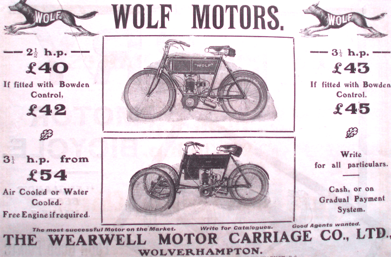 “THE WEARWELL MOTOR Carriage Co, Wolverhampton, have a small number of their last year’s 2¾hp motor-bicycles unsold. Some are shop soiled and a few are secondhand. All, however, are, we understand, in perfect running order, and are being offered at very low prices with a view to effecting a clearance.”