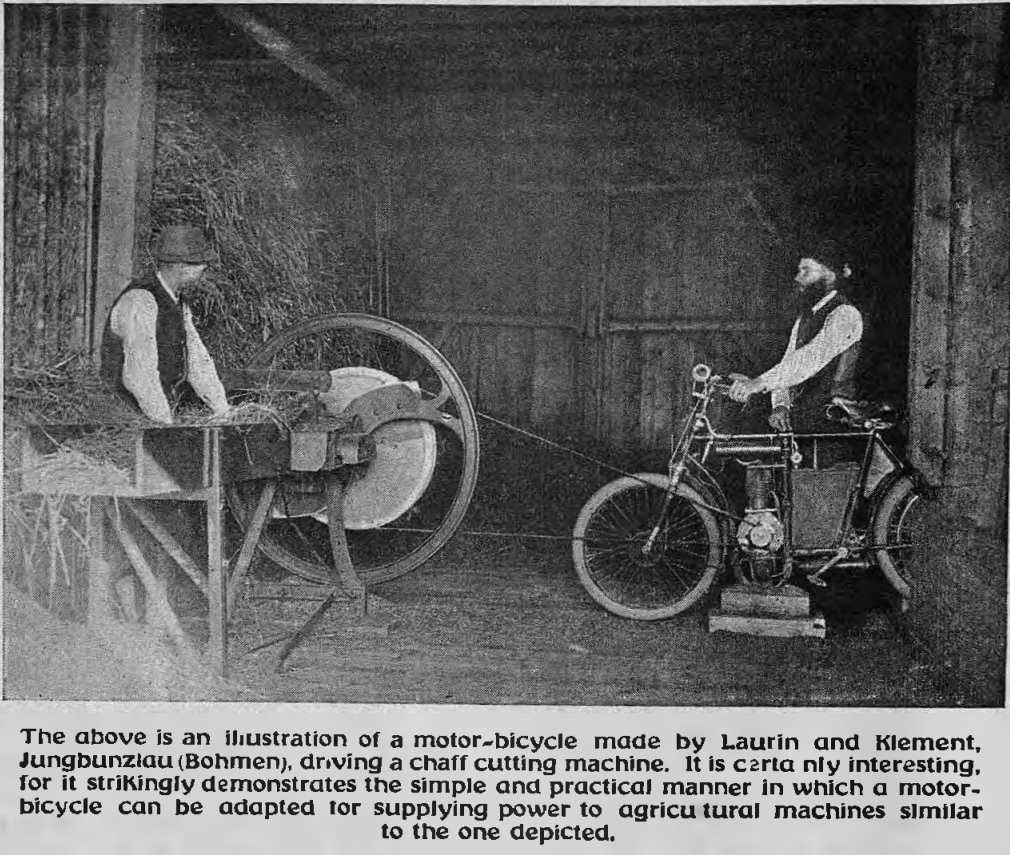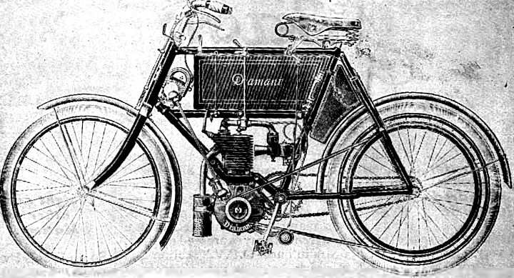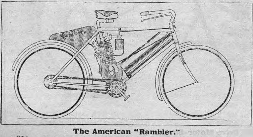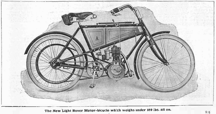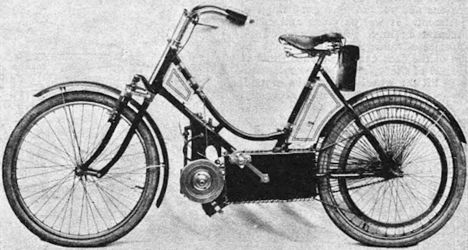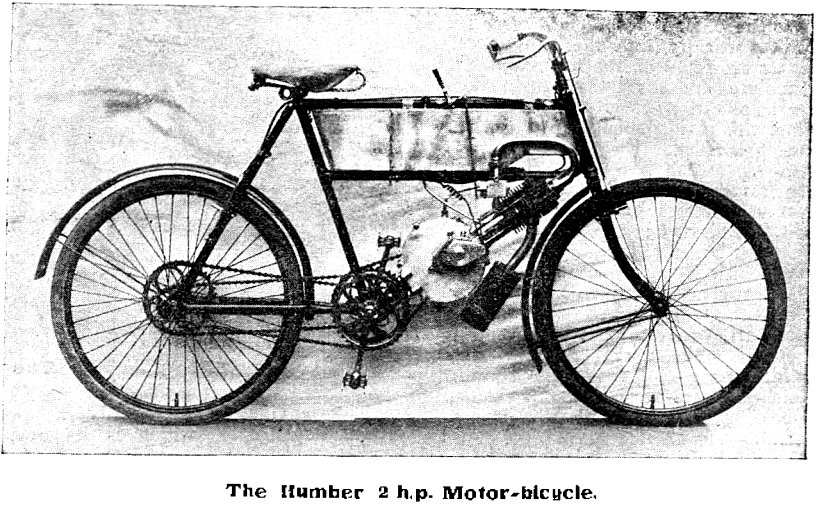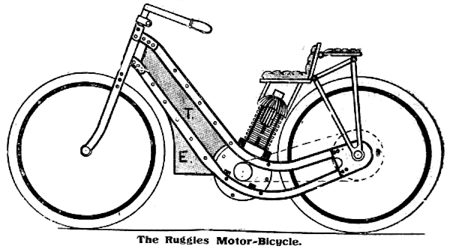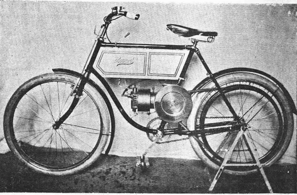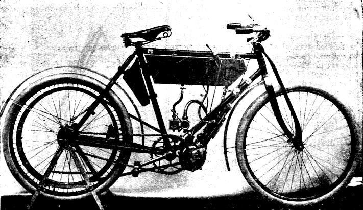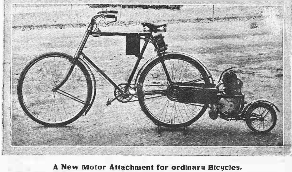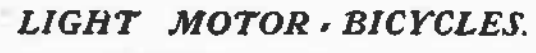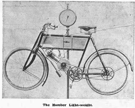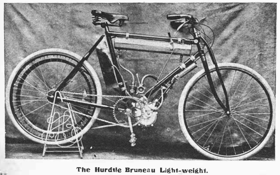 “The Hurdtle and Bruneau feather-weight machine has a very small hp engine driving by V-belt. The frame and general equipment is practically the same as on an ordinary bicycle. This machine scales 551b and is intended for light work and pedal assistance on steep hills.”