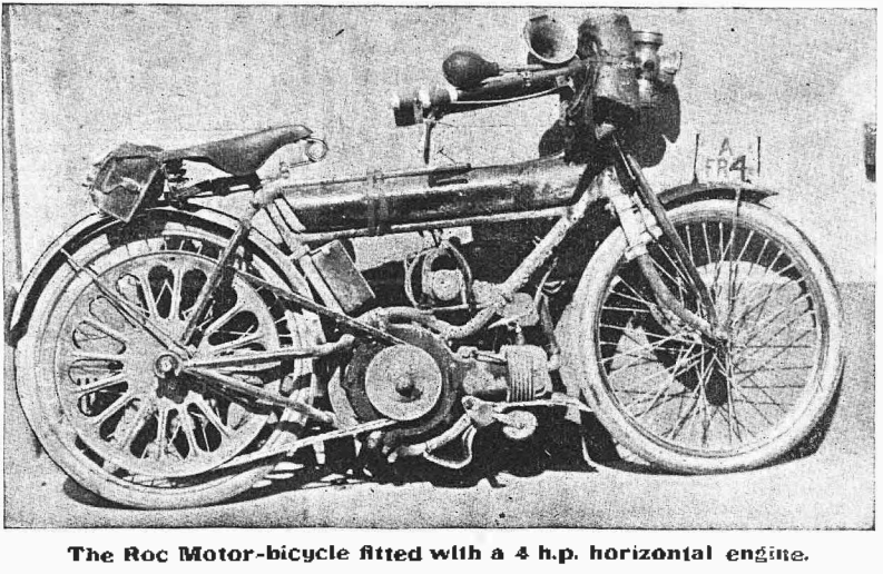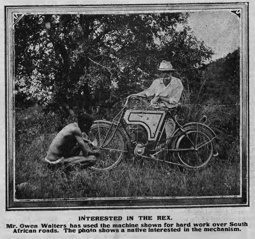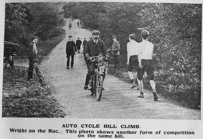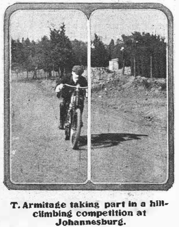 MOTORCYCLING IN SOUTH AFRICA. Our illustration shows Mr T Armitage riding his 3hp Imperial Rover at 14mph up a 1 in 8 gradient in a recent hill-climbing trial at Johannesburg. The occasion was a meeting of the Johannesburg Motorcycling Club, which included various races. A reliability run to Roodeport and back (maximum speed allowed 12mph), ended in Messrs Kock and Attewell gaining six points each. In the hill climb Mr Armitage, still riding a Rover machine, did fastest time, Mr Kock (2hp Werner) being second. In a subsequent ‘start and stop’ event, Messrs Lynn, Hanscombe, Murkett and Cotter came off best.”