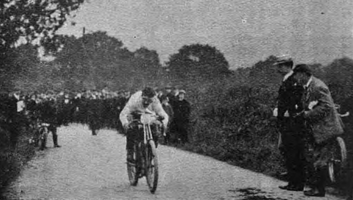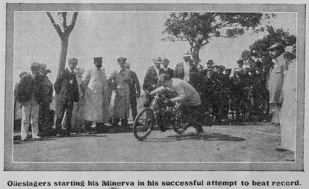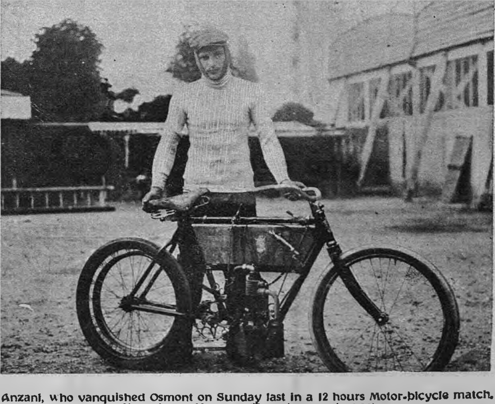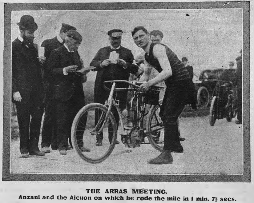 “THE HOUR RECORD. Up to a few weeks ago, the world’s hour motorcycle record stood to the credit of one or other of the crack pacemakers who from time to time trailed a bicycle rider over 60 minutes in record time, Cissac, on a 16hp machine, who paced Darragon, the present hour bicycle record-holder 54 miles 1,058 yards in the time, being the last pacemaker to hold the motorcycle record. Now the figures stand to the credit of that daring driver, Anzani, who, on an Alcyon, fitted with a Buchet engine, 90x90mm, giving about 3¾hp, covered 54 miles 1,368 yards in the hour from a standing start. This is 5 miles 568 yards in advance of George Barnes’ British hour record, but if the skilful little English rider had such a track as the Parc des Princes, Paris, for daily practice, we fancy he would soon add a few miles to his present record.”