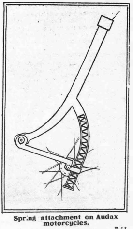 “LAMAUDIER, MAUGER, AND CO, Levallois Perret, show the Audax machine in numerous types. These are mostly fitted with vertical engines of the 3hp, and V-belt transmission. The outside fly-wheel of engine originally made by this firm appears to have been abandoned, as all the engines shown have inside fly-wheels. A curious arrangement on one racing machine shown is an extra exhaust passage near the end of the stroke. There is an exhaust pipe bolted on and some arrangement for trapping the oil provided: this extra pipe joins the main pipe. A new spring fork calls for special mention: the main fork branches off into two arms, the forward one carrying a rocker at the end of which the wheel axle is fixed, the other arm containing a spiral spring; a projection on the rocker engages with it. The arrangement seems to give a good action. The brakes act on the back wheel rim and belt rim. Several types of spray carburetter are shown, but the Longuemare type predominates. The engine is supported at the cylinder head by four bolts screwing into it: the main supports are on the crank-case. A feature calling for comment is the scarcity of radiators on the engine, there being only four, spaced wide apart. One machine has the Griffon spring fork fitted.”