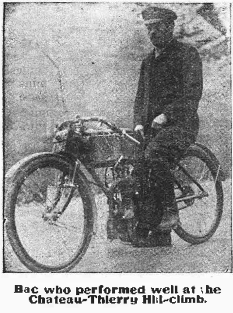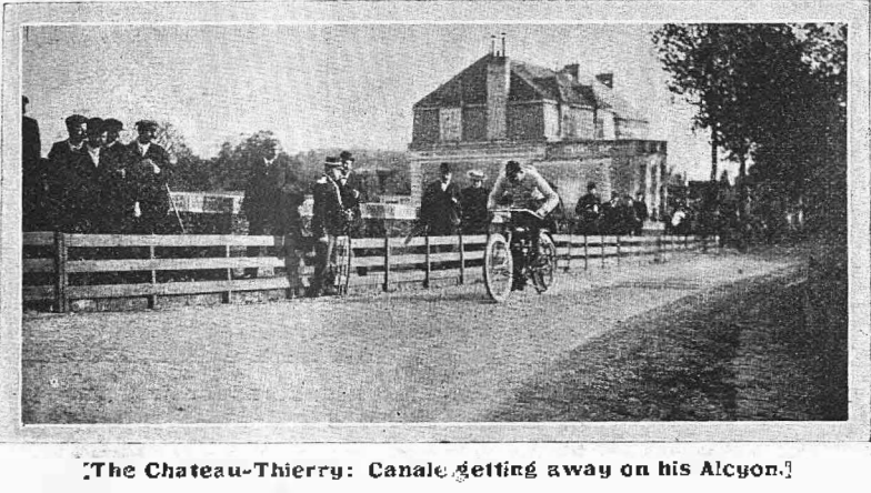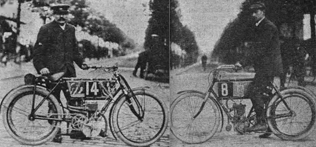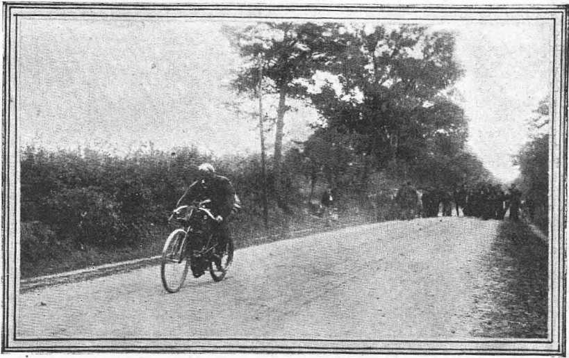 “THE THIRD ANNUAL HILL CLIMB at Chateau-Thierry was this year favoured with splendid weather, and passed off most successfully. The competition is confined to touring vehicles (motorcycles as well as cars), and in addition to prizes given for the best performances over the one-mile climb, there are prizes awarded for general excellence in the design, arrangement, and all-round appearance of the vehicle from a touring point of view. ChateauThierry is situated some 40 miles east of Paris, and the hill on which the trials took place is a long ascent as steep as 1 in 10 in places, and allowing of a splendid course of one mile in length. More stringent regulations had been put into force this year, and the competing cars and cycles were, generally speaking, strictly touring in character, and not, as in many cases in previous years, racing machines…Competitors were divided into seven classes, one of which comprised motor-bicycles…represented by the following makes: Magali, Griffon, Alcyon, Neckarsulm, Stimula-Vandelet, La Fauvette, Carreau, La Foudre, and Ideal. We append the principal results:1st, Collomb (Magali), 1 min. 43⅘sec; 2nd, Bac (Magali), 1min 47⅖sec. The first prize in the touring awards went to Neckarsulm.”