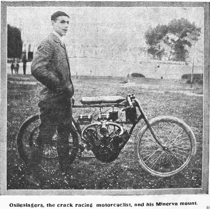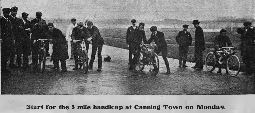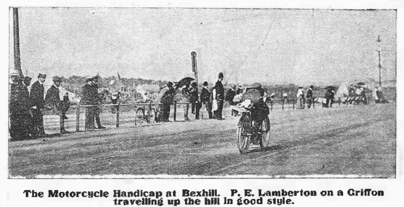 “MOTORCYCLE RACING IN AUSTRALIA. Reports of the League of Wheelmen’s meeting at Adelaide indicate that motor racing arouses a good deal of interest ‘down under’. Some excellent performances were accomplished on the grass track, H Deards (an Englishman and champion of Australasia) and W Reynolds showing good form. A five miles motor handicap was won by Reynolds (100sec start) in 7min 27sec, Deards (who started from scratch) being close behind. Deards subsequently succeeded in lowering the record of the five miles flying start from 6min 15sec to 5min 54sec.”