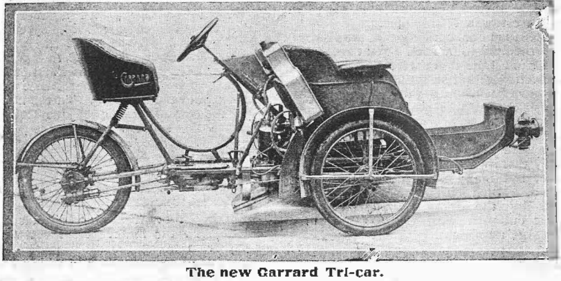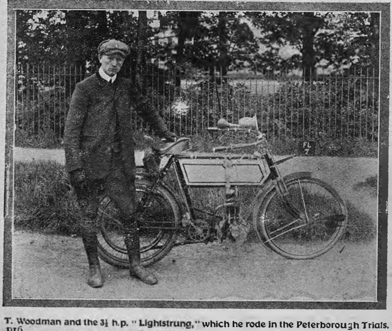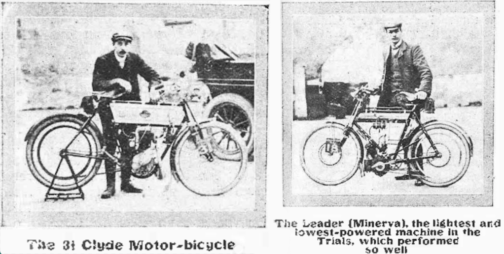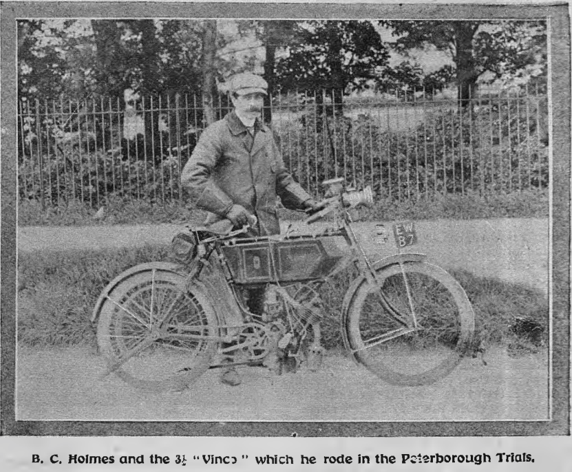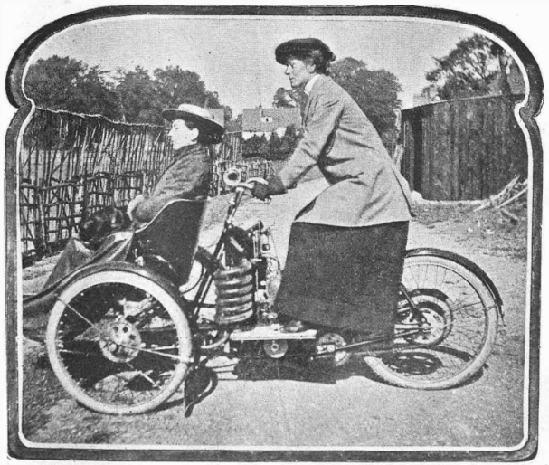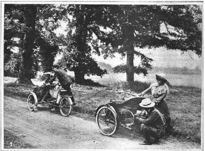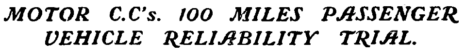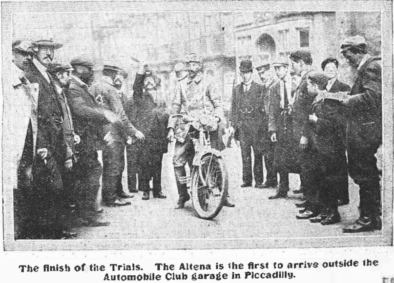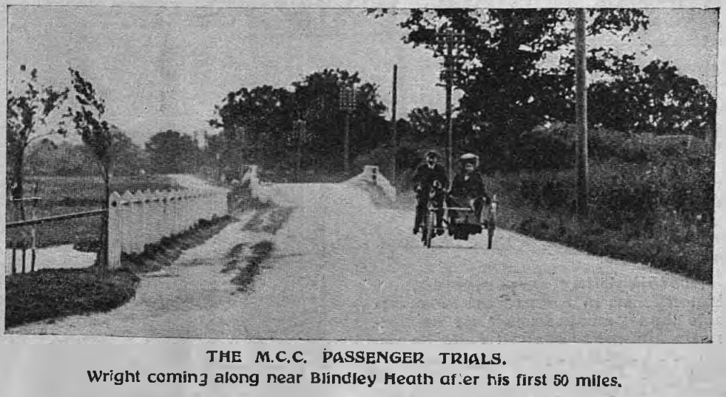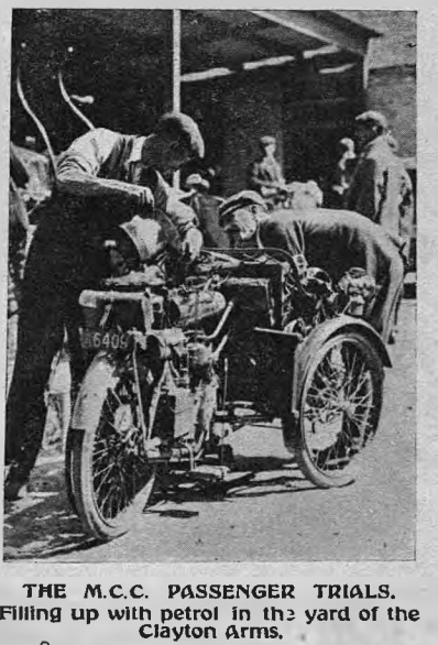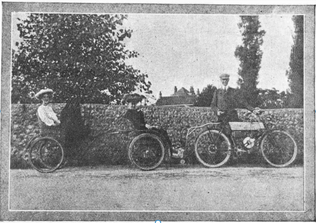 “THE FINALS OF THE trials for motorcycles carrying lady passengers, organised by the Birmingham Motor Cycle Club, were held on Saturday week last. The preliminary event consisted of a 50 miles non-stop run (25 miles out and home on the Chester road, starting from the Royal Oak, Streetly. Seven entries were received: S Downing (3½hp Allday’s tri-car); CG Garrard (7hp twin-cylinder Garrard tri-car); C Thompson (4hp Smith’s o’ Saltley motor-bicycle and trailer); FR Gould (3½hp WA Lloyds’ bicycle and trailer); CR Townsend (4hp New Revolution tri-car); and EW Winckle (3¼hp Hamilton tri-car). Of these three dropped out, viz, Garrard (short of petrol), Gold (tyre troubles), and Walker (broken sparking plug). The four left in competed in a ‘starting and stopping’ trial over a measured distance (about a third of a mile), with the following result: Downing, 1min. 15⅗sec, first; Townsend, 1min 35⅕sec, second; Winckle, 2min, third; and Thompson, 2 min 30sec, fourth.”