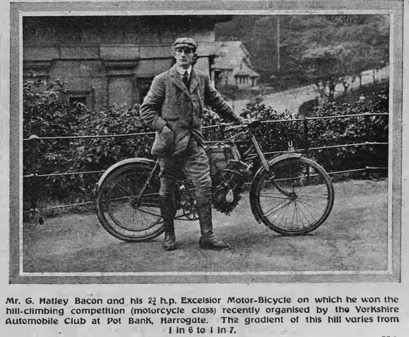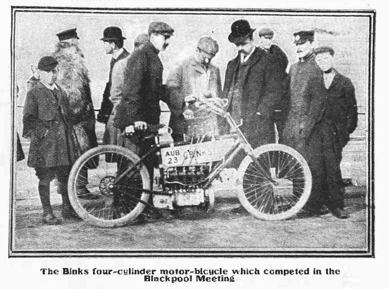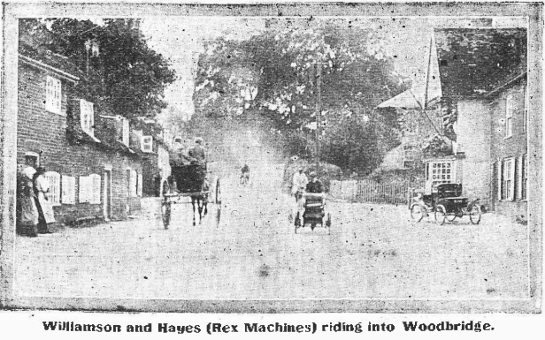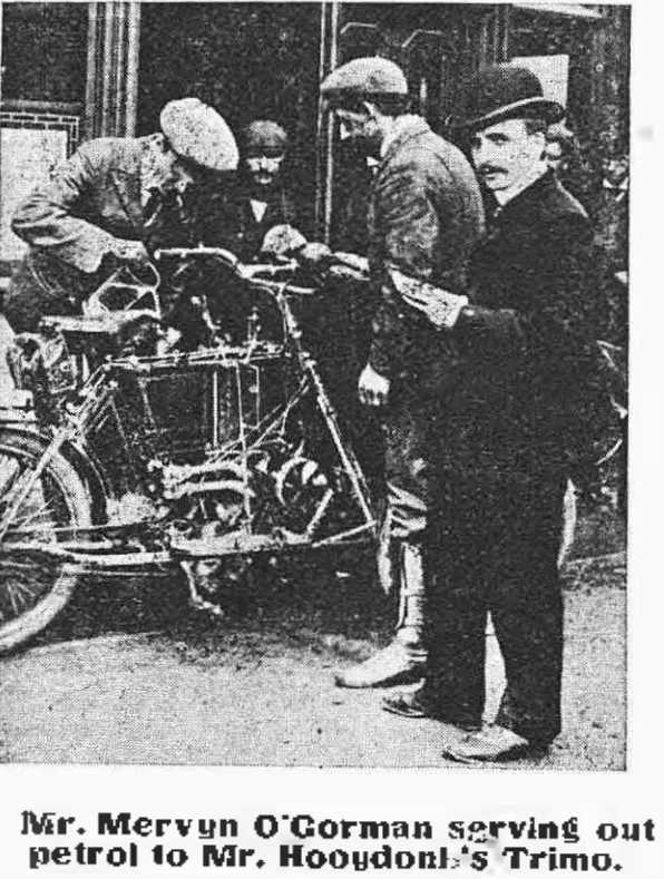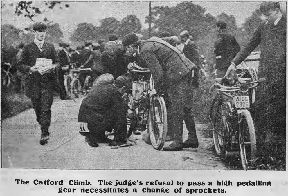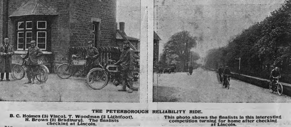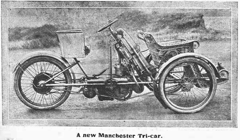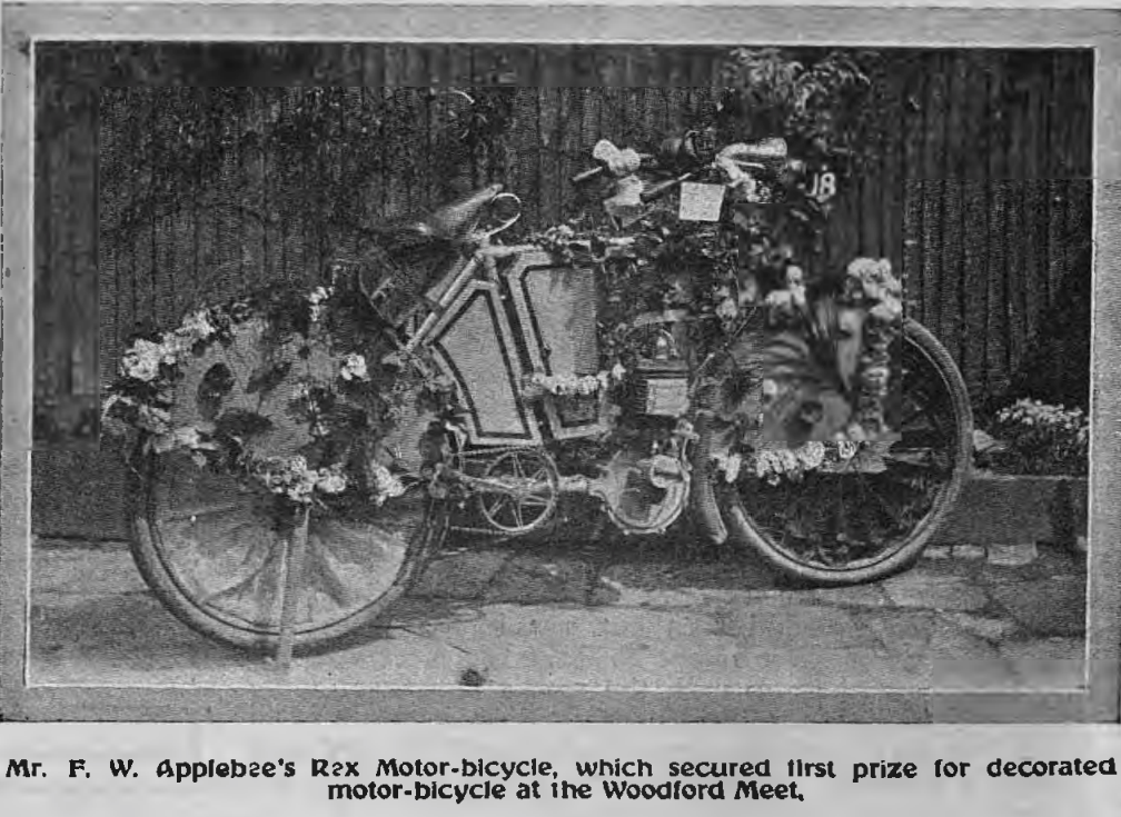 “THE FINALS OF THE trials for motorcycles carrying lady passengers, organised by the Birmingham Motor Cycle Club, were held on Saturday week last. The preliminary event consisted of a 50 miles non-stop run (25 miles out and home on the Chester road, starting from the Royal Oak, Streetly. Seven entries were received: S Downing (3½hp Allday’s tri-car); CG Garrard (7hp twin-cylinder Garrard tri-car); C Thompson (4hp Smith’s o’ Saltley motor-bicycle and trailer); FR Gould (3½hp WA Lloyds’ bicycle and trailer); CR Townsend (4hp New Revolution tri-car); and EW Winckle (3¼hp Hamilton tri-car). Of these three dropped out, viz, Garrard (short of petrol), Gold (tyre troubles), and Walker (broken sparking plug). The four left in competed in a ‘starting and stopping’ trial over a measured distance (about a third of a mile), with the following result: Downing, 1min. 15⅗sec, first; Townsend, 1min 35⅕sec, second; Winckle, 2min, third; and Thompson, 2 min 30sec, fourth.”
