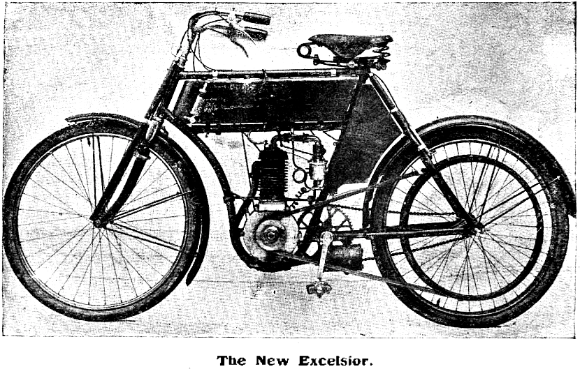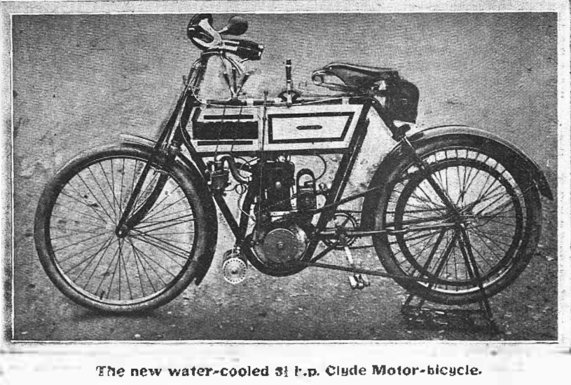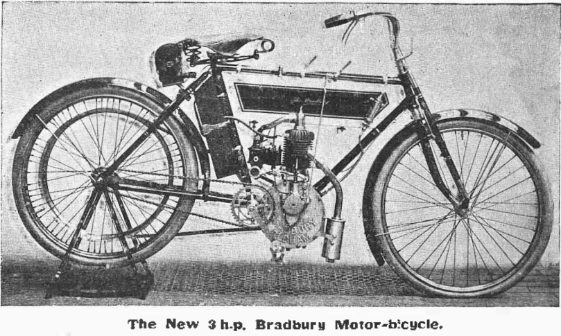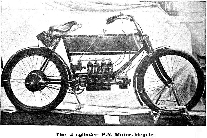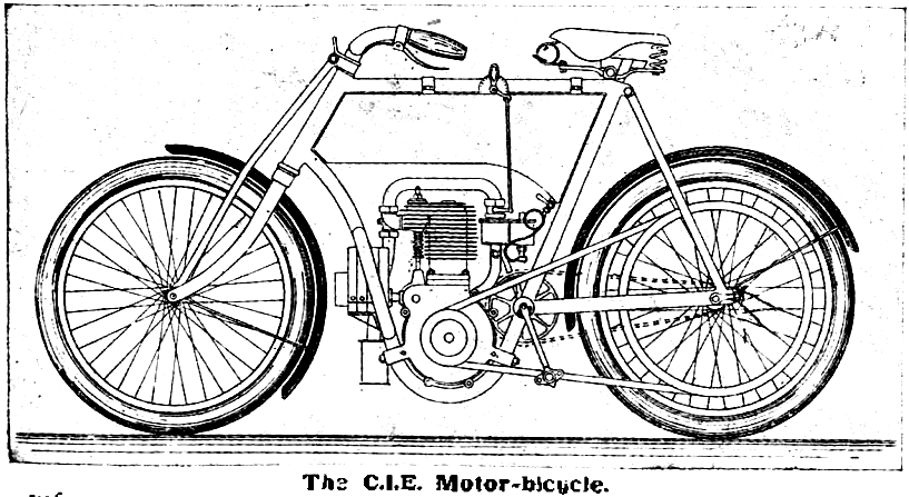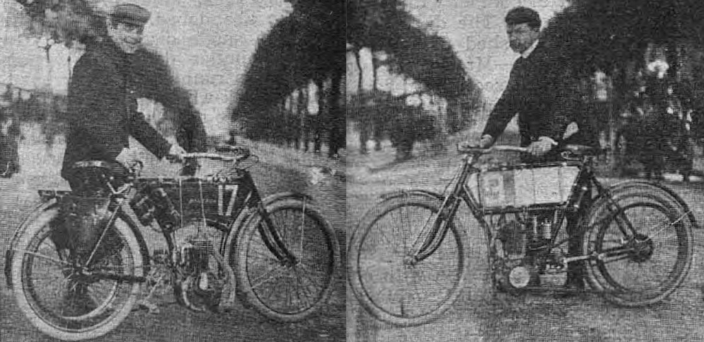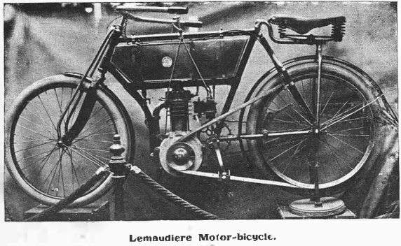 “A WELL-MADE 4½hp water-cooled engine bicycle is shown by L Bonin, Paris. There are no pedals, but footplates are provided. The radiator and tank are mounted in the fore portion of the tank, and is arranged on the thermo-syphon principle. A novel type of clutch is fitted on the engine shaft, worked by vertical rods and handles from the top tube of the frame. The ignition is on the usual high-tension principle, and drive is by a flat belt. The engine is arranged to be started by a handle on the engine shaft. A facing machine shown has the same engine as the touring machine, but the frame is of a different type, the saddle being arranged over the centre of the rear wheel. The steering handles are brought right back in a long sweep. The transmission on this machine is by chain, and has the free engine and clutch, as in the other model. Duplex forks and extra large tyres are special features of this machine.”