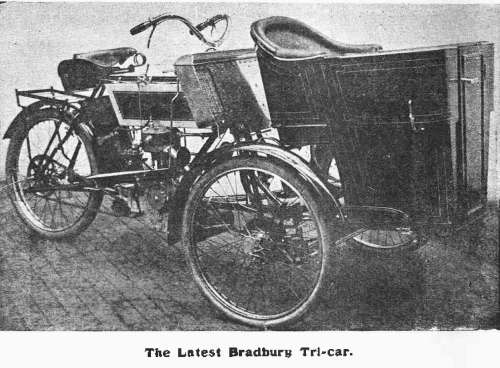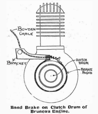 “BRUNEAU AND CO, TOURS, have specialities in motorcycles with combined water and air-cooling for the motor. A 3½hp bicycle and a 3½hp fore-car with chain transmission have some interesting features. The back chain wheel has a spring centre to absorb the engine shocks. On the outside of the free engine clutch drum a band brake, actuated by Bowden wire, is fitted. The water tank is placed in the fore-part of the frame and holds about one gallon. Two neat radiators are mounted alongside the tank. The circulation is on the thermo-syphon principle. The head alone of the engine is water-cooled. The fore-car frame has no stays running from the front cross tube to the rear axle, as is considered the best practice in this country. The carriage has open sides on a tubular frame ; and the brakes consist of one on the engine clutch and a back wheel rim brake. A very strong chain is supplied. High tension ignition and FN spray carburetter are also fitted.”