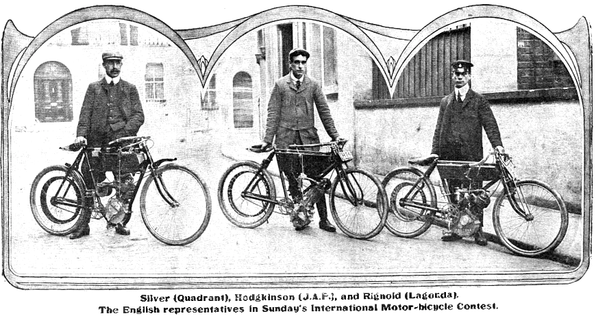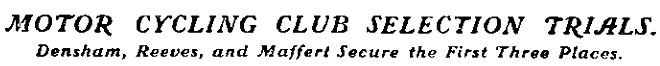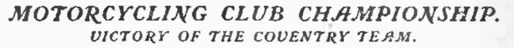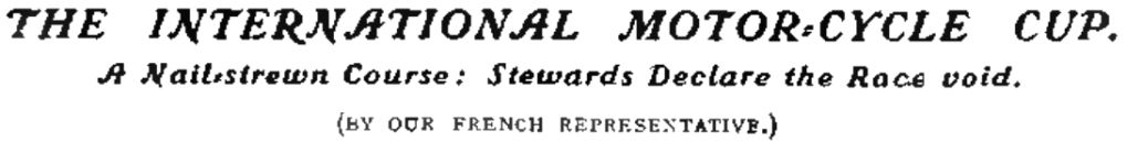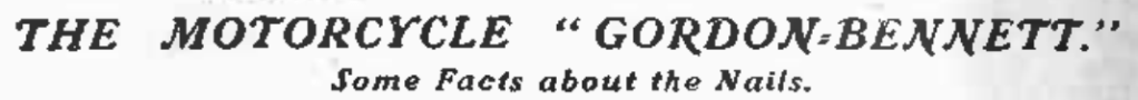 “IN REPLYING TO THE TOAST of ‘The Club’ at the annual dinner of the Auto-Cycle Club on Wednesday last, the vice-chairman Mr GF Sharp announced that the final difficulties in the way of a great open motorcycle race in this country had been overcome, and that it had been arranged to hold an eliminating contest in order to select a team to represent England in the International Motorcycle race. The eliminating race will form part of the programme in connection with the English selection contest for the Gordon-Bennett race. The same route will be followed, and the controlling and timing arrangements organised for the car race will be available for the subsequent motorcycle race. Negotiations are still proceeding in the matter of the course, and it is generally hoped that the one in the Isle of Man will be chosen. This will be the first great race of motorcycles ever held in this country, and the Auto-Cycle Club propose to make it doubly important by arranging that it shall also be a complete race in itself, open to all British built motorcycles. Such a race will obviously effect an enormous amount of good, encouraging, as it will, the development of the light and efficient motor-bicycle, and we are pleased to confirm an offer, made to the Auto-Cycle Club on the occasion of the dinner, of a trophy that shall be worthy of the event. Such a race held annually will give an enormous impetus to motorcycling, and if it be held in May or early June, the riders who finish first, second, and third will have time to get fully prepared for the big International race in which they will represent England. The Auto-Cycle Club has decided to enter for this event provided only that the French club gives its guarantee that every’ effort will be put forth to secure fairness for the foreign competitors (including a cessation of the mysterious nail-strewing).”