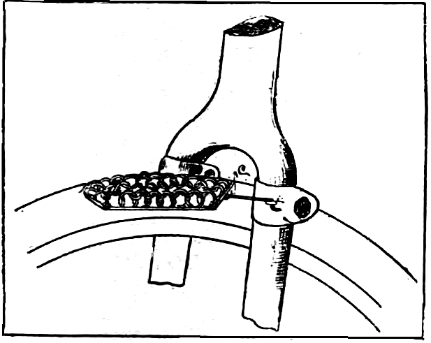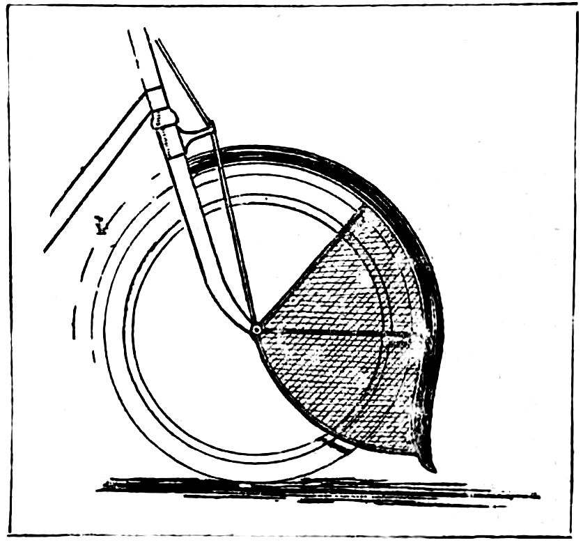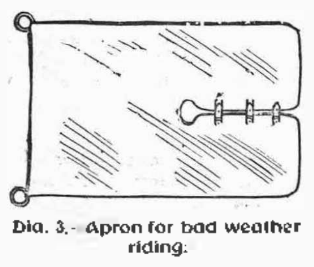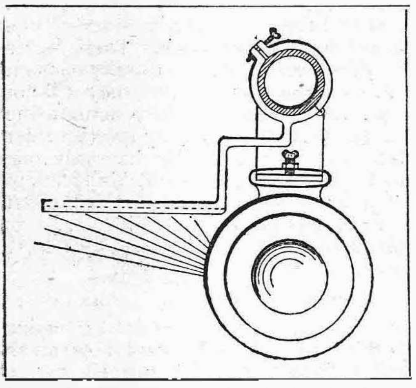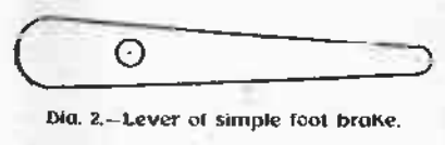 apron one can defy the elements, and can let go of the handles to light a pipe if necessary, as it is possible to steer quite well with the feet. Certainly one cannot go so fast as on a bicycle, but one can average a good seventeen miles an hour up and down hill—more than this with an air-cooled motor will overheat the engine; perhaps with a water-cooled head one could do more, but I prefer the slower speed without this complication. Footrests are a great comfort, they keep the feet free from mud; and, as I said before, you can steer with them. With the feet on the pedals there is danger of the clutch seizing. This happened with me on one occasion, and owing to the pace at which the pedals revolved and the suddenness of the occurrence it was a marvel that I was not thrown off…As luck would have it my knee caught the lever which closed the throttle, and this brought the tricycle to a standstill. This was in the days of the tube ignition. My footrests are in the form of pedals, and are adjustable on a round bar which is attached to the front fork of the tricycle. By means of this bar I have been able to fit some very simple and reliable foot brakes. These consist of a piece of wood about 6in long, with a hole near one end, which just fits over the bar. The short end presses against the rim of the front wheel when pressure is put on the other end with