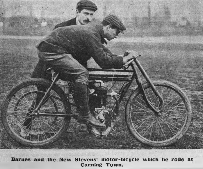 “GA BARNES IS BUILDING a light road machine fitted with the Stevens 2¾hp engine, and wood rims. The rims, which were specially made, are designed for Constrictor road tyres, which are bound to the rim with canvas in a similar manner to the racing tyre.”