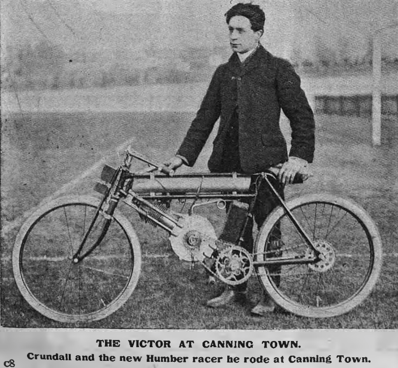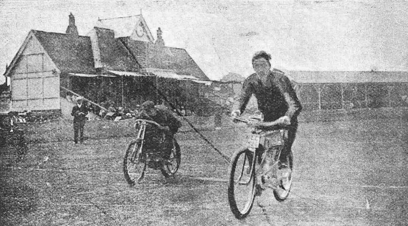 “THIS IS THE TIME of year when the cycle tracks are besieged by motorcycle record breakers, and GA Barnes and H Martin have set the ball roiling by sharing between them the new record figures from 33 to 100 miles. The performances were accomplished at Canning Town on Friday, October 28th, Martin, as usual, riding an Excelsior, and Barnes a machine of his own make. It should be mentioned, however, that Martin’s mount was of an-old type, with surface carburetter, and fitted with mudguards and brake. Barnes was the first to go, and he got inside record at 33 miles. From that point onwards, he established new figures up to 50 miles, and beat his own one hour record en route. The previous best for 50 miles was made by TE Newman (Chase), at Canning Town, on November 18th, 1903. The principal times in Barnes’s ride were:—One mile, 1min. 19⅕sec; five miles, 5 min 55sec; 10 miles, 11min 50⅘sec; 25 miles, 29min 53sec; 50 miles, 60min 42⅖sec. Barnes’ new hour record is now 49 miles 800 yards. Delayed somewhat by Barnes’ ride, it looked as though Martin would not finish his task in daylight, and indeed it was almost dark when he completed the 100 miles. So much so, in fact, that Mr AV Ebblewhite, who timed on both occasions, had to strain his eyes to see the rider cross the line. Martin’s times, all records, were:—51 miles, 1hr 8min 39sec; 75 miles, 1 hr 45min 13⅖sec; 100 miles, 2hr 21min 45sec. Martin’s distance for two hours was 85 miles 1,680 yards.”