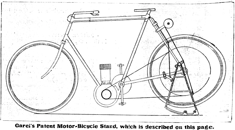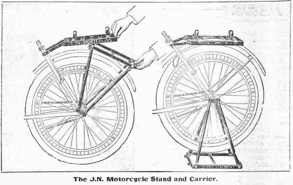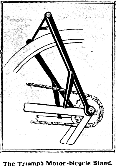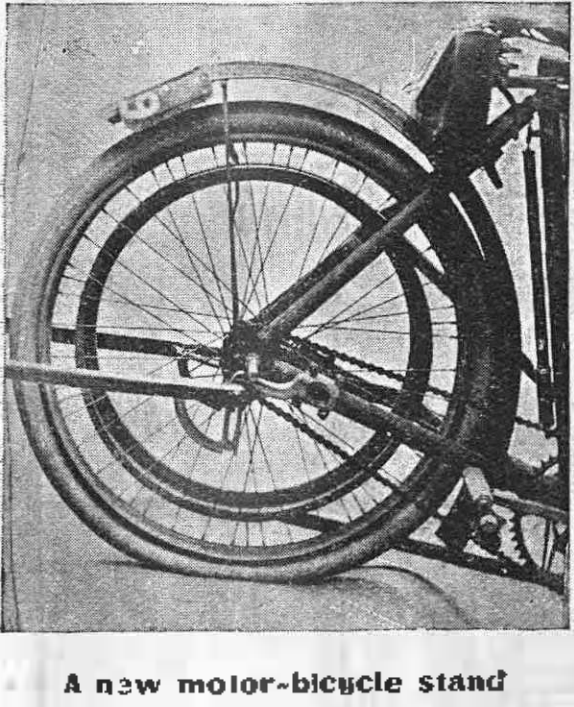 “A NEW MOTORCYCLE STAND. An improved stand has just been introduced by Messrs Castell and Sons, cycle makers, 154 and 164, Malden Road, Kentish Town, London, NW. The special feature about it is that the back wheel can be taken out without interfering with the stand, as this clamps on to the stays. The illustration shows its position when out of use. It is priced at 10s 6d.”