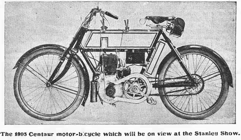“A WELL-FINISHED touring machine of 3½hp, named the Centaure, is shown by Flinois and Bonnel. This machine has a very neat spring fork—one of the best in the exhibition—and also a free engine clutch of a very simple and effective type, which can be arranged to work by a twisting handle.”