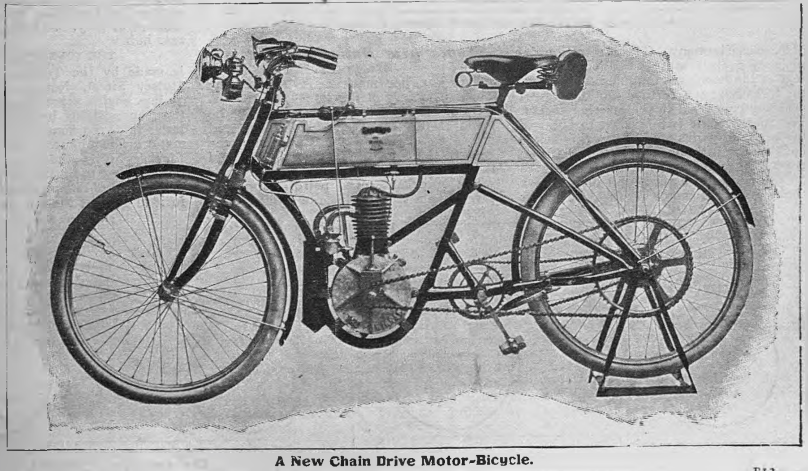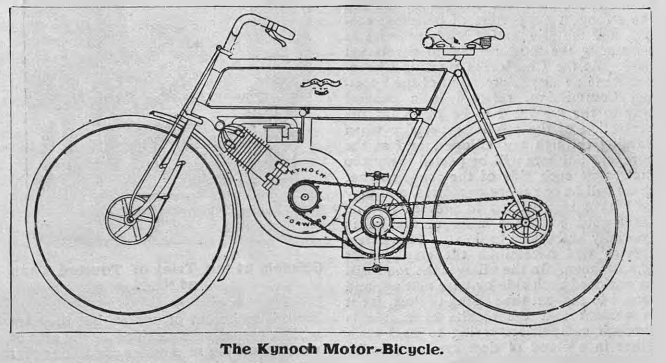 “THE KYNOCH MOLOR BICYCLE. Kynochs, of Birmingham, have introduced a chain drive motor-bicycle. This has a 3hp air-cooled engine mounted in a slanting position, and occupying the place of the usual down tube, the cylinder top and crank case lugs being held in special brackets. Two chains are used in the transmission, a countershaft at the pedal axle forming the first reduction. A spray carburetter is used and ignition is by coil and accumulator. All the control levers and minor gearing details have been carefully worked out. The petrol tank is of large capacity. Two brakes are fitted, and the general equipment and workmanship are of the best.”