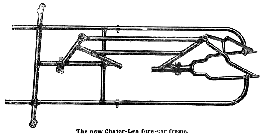 “ONE OF THE BEST-CONSTRUCTED fore-carriages in the Exhibition is that of E Chielus and Co, 5, Place Pigale, Paris. The front axle is suspended on flat springs, and the frame is very rigid. The main support for the engine is made of channel steel, and is extended to the back fork, to which it is brazed. The fore-car is clamped on what is practically a separate frame bolted to the central main tube. The engine is a 4hp Aster. A very capacious water tank is fitted behind the fore-car, and the radiators are placed below it.”