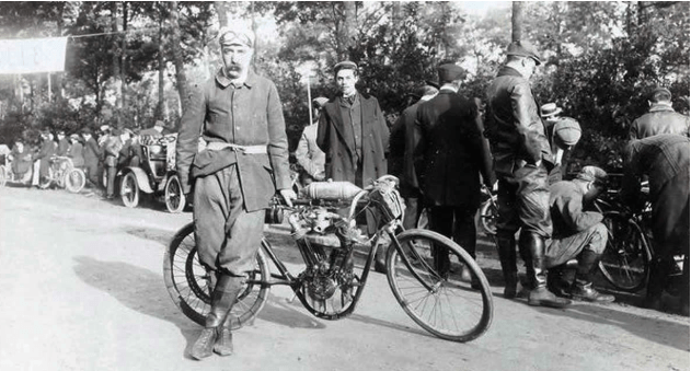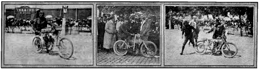 “FIRST AMERICAN MOTORCYCLE CHAMPION. The first hall-marked American motor-cycle champion is GH Curtiss, of Hammondsport, New York, and he won the title at the Empire City meet at Yonkers, New York, on last Decoration Day, when he defeated the pick of the ‘Simon pure’ motorcyclists in a fast five-mile race. Curtiss rode the 5hp two-cylinder belt-driven ‘Hercules’. There was no semblance of a race; Curtiss took the lead at the pistol-shot, and no one ever got within hailing distance. The race brought out many of the men who had participated in the hill-climbing contest of the New York Motor Cycle Club in the morning. Curtiss had won that, and it was fully expected by the cognoscenti that he would duplicate his performance. The men were lined up near the head of the straight and came to the tape at a fair pace; but the starter refused to give them the signal, as two or three men were somewhat in the rear, and they rode around for another start. This time they ‘bunched’ finely and, getting the pistol, dashed ahead. Half a mile had not been covered before it was seen that, barring accidents, Curtiss was the winner. He opened the gap between himself and the nearest man at once and steadily increased it. At about three miles he lapped the tail enders and eventually won in 6min 34sec, GW Holden being second and FW Rogers third.”