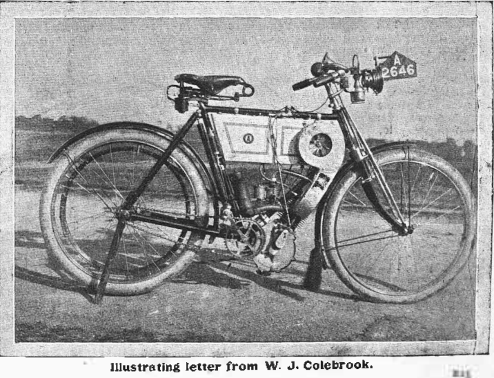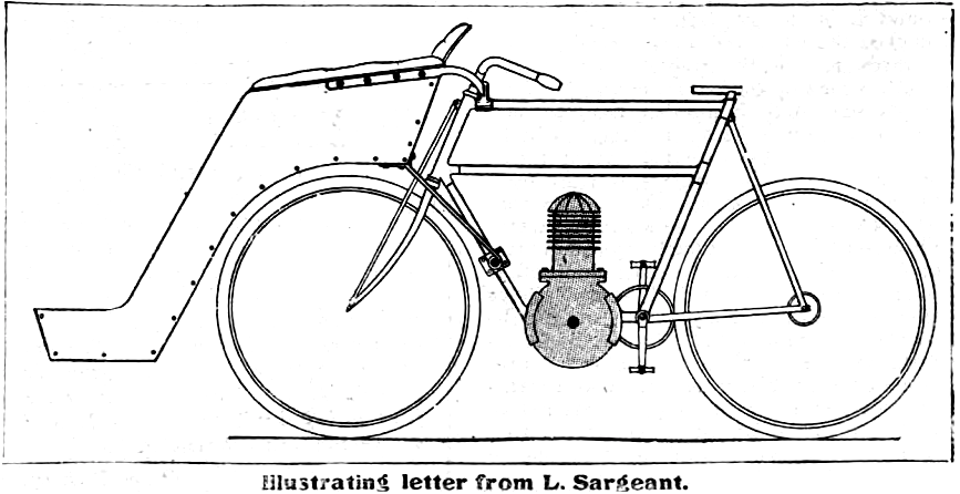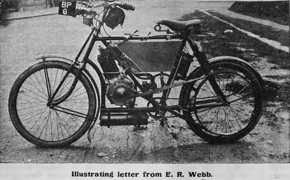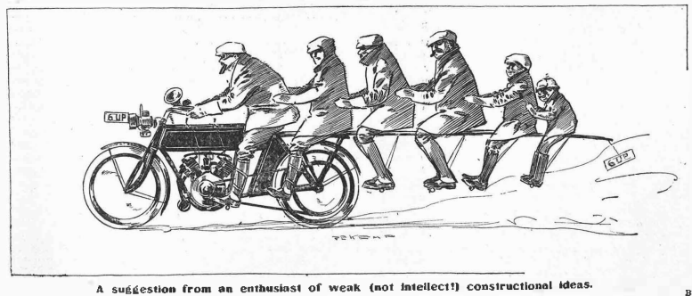 “WHY NOT THE MOTOR SIDE-CAR? Personally, I have found a 2hp engine all I require for the propulsion of my motorcycle. It is light, convenient, easy to pedal, and scales only about 80lb. I use a gear of 7 to 1, which, with slight assistance, will get me up many very stiff gradients. I, however, make no secret of the fact that when I take a trailer with the machine, I have a troublesome time on gradients; so much so, in fact, that I am now preparing a side-car which is to have a 1¾hp engine attached, to drive by belt to the outside wheel. I intend connecting the exhaust lift and spark advance to my present levers; and I also intend carrying separate carburetter, coil and battery on the side-car. I believe this arrangement will be satisfactory and I think it will be the correct solution of the passenger problem, for without rendering my cycle unnecessarily heavy or clumsy, I can have a good 3½hp available when taking a passenger. Therefore, I ask: Why not retain the 2hp engine with comparatively light weight? And, when required for passenger use, why not adopt the motor side-car?