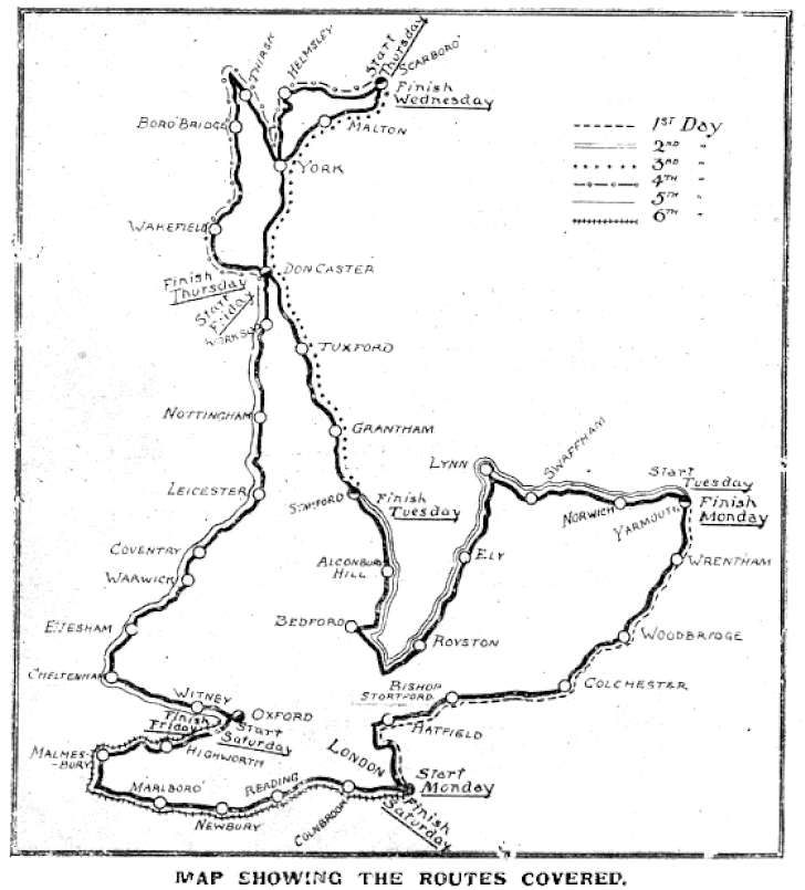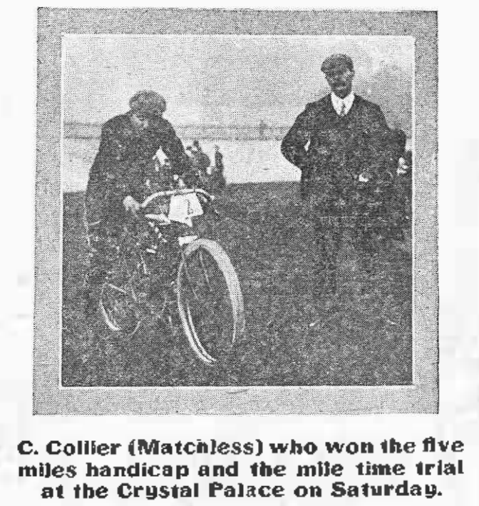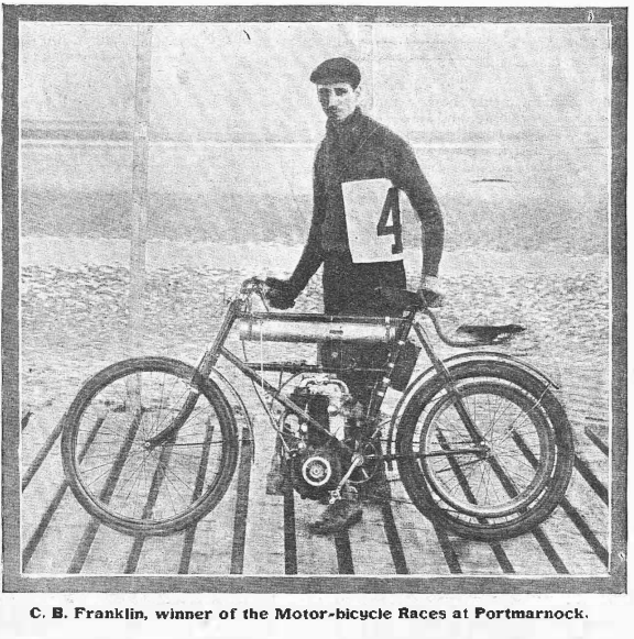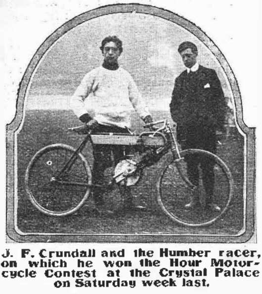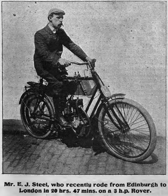 “CROYDON MOTOR CLUB. The annual non-stop run in connection with the above club was from Brighton and back, a distance of 80 miles. The first award was the president’s silver cup and special gold medal, the second prize being a gold medal. There were nine entries, but in consequence of the unfavourable road condition the starters were reduced to five. Mr CW Brown, acting as starter and timekeeper, gave the word ‘go’ soon after 8am, the riders being Messrs Martin, Steel, and the brothers Bradbury. The first to drop out was Mr F Bradbury, who retired at Crawley on the outward journey, whilst his brother gave up the contest soon after leaving Patcham on the return. Messrs Martin and Steel, who were mounted on the Excelsior and Rover motorcycles respectively, completed the journey, each gaining the maximum number of marks. A second round over the same course was therefore necessary. This was immediately undertaken, the result being almost the same, except that Mr EJ Steel was compelled to dismount at Dale Hill to avoid a herd of cows, for which one mark was deducted. The holder therefore retains the ‘Brown’ trophy and secures the special prize. The second award, of course, went to EJ Steel.”