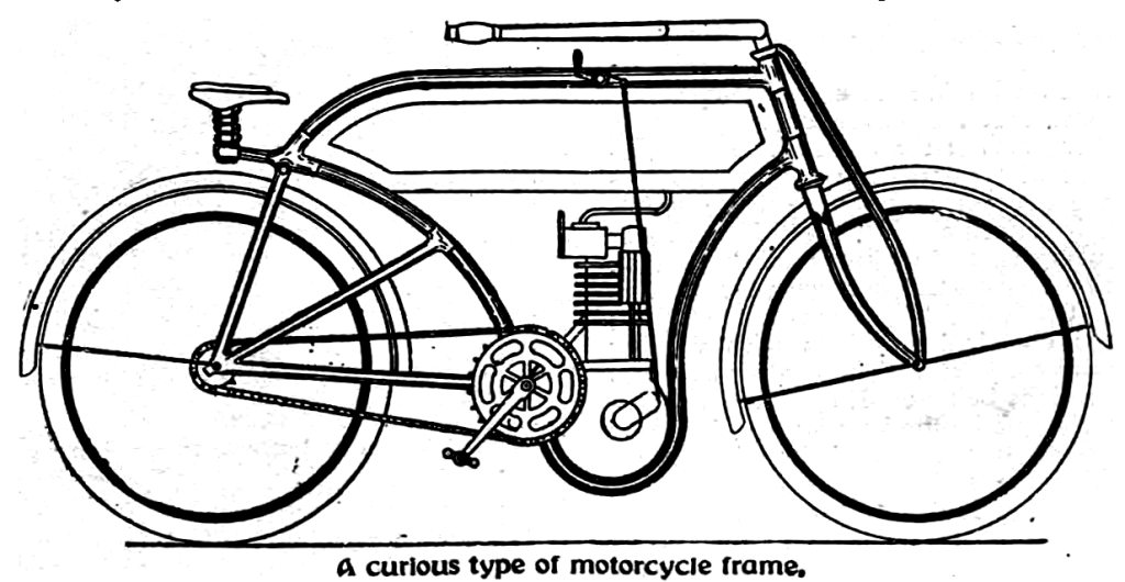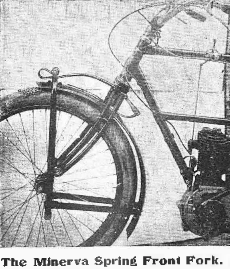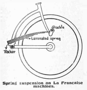 “A NOTABLE FEATURE of the La Française stand is a 6hp twin-cylinder machine with V-belt drive. The tank is a very capacious one, holding nearly three gallons petrol. The front forks have a spring suspension of a novel type. The wheel is carried at the ends of horizontal forks, the other ends being pivoted on a bar supported by two curved tubes running from the fork crown. A flat laminated spring connects the curved tubes and main fork. One end of the spring is rigidly fixed to the horizontal forks so that when the wheel is pushed upwards by an obstacle it tensions the spring, which thus takes up the shock. It seems a very effective device.”
