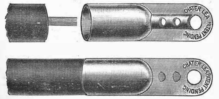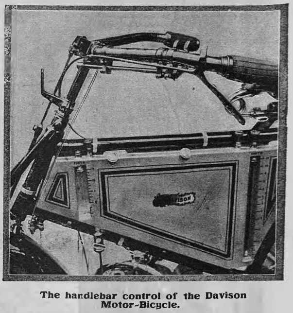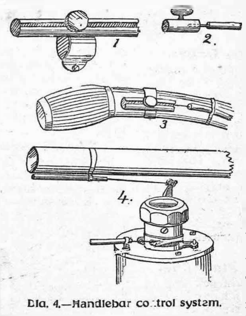the foot: a short spiral spring draws it back into position again…Handlebar control is another very great advantage and I am sure anyone who has once tried it would never be without it again. The method I use, which I think is the simplest, is by means of thumb slides consisting of a piece of slotted tubing about 2½ inches long with a clip for fastening to handlebars’ as shown at 1. The slide fits easily into the tube and is moved backwards and forwards by means of the button. One end of a piece of Bowden brake wire is attached to the slide and the other end to the gas or air lever. It is essential that the outer portion of the Bowden wire should be firmly fixed close to the slide and also to some portion of the frame of the machine near the gas or air lever. The advantages of being able to control an engine without removing the hands from the handles are invaluable; more especially is this the case at starting, when a firm grip of the handles is necessary to properly pedal. Also in heavy traffic and at night the exact position of the various valves can be told by the feel alone. For the past two years I have ridden a Dennis tricycle with a 2¾hp genuine De Dion engine, air-cooled, and I must say I have had very little trouble with it. One often reads of axles twisting off. I remember mentioning this to the makers after buying my machine, and they offered to give—I forget how much—to the local infirmary if such a thing happened to my tricycle. But I am happy to say it never has happened. So much for tricycles. They seem quite out of date now, and it is exceptional to meet one on the road. But I am certain they will come in again—and, no doubt, very much improved; for they are, I think, open to improvement in certain respects. I should like a free engine to start with and also for going down hills. Two speeds are desirable where the country is very hilly; but in that case I am sure one would require a water-cooled head. I think also a belt or chain driven machine would be an improvement on the present system of gear wheels.”