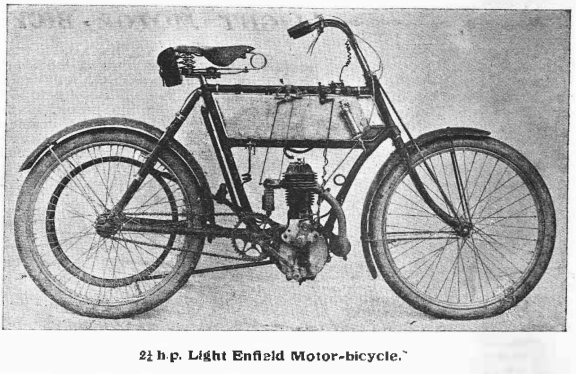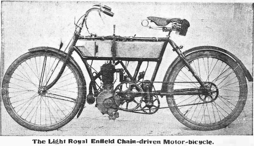 “THE ROYAL ENFIELD motor-bicycle has many features distinctly original in design. The engine is carried in a cradle, which forms part of the frame, it is quite vertical, and the weight is well distributed. The transmission is by reduction gear incorporated in the engine and thence by chain to the rear sprocket, thus allowing one chain to serve for driving and pedalling. It will be seen from the illustration that the pedal chain wheel only engages with the lower side of the chain. There is a spring driving sprocket on the engine shaft and a friction clutch on the rear wheel, this being operated by a small lever on the top tube of the frame. The reduction gear causes the contact breaker shaft to revolve at one-sixth the speed of the engine, hence it has three contact positions. The ignition is by trembler coil, and two sets of accumulators are provided. The carburetter is a specially designed spray type with throttle. The front forks are extra strong, and a band brake is fitted to the front wheel. The rear triangle of the frame is strengthened by an extra tube forming another triangle at the bottom bracket. The price of this machine is 40 guineas.”