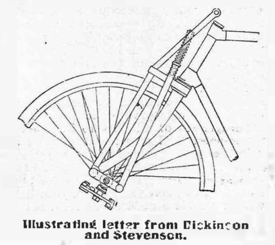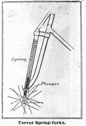 “SINCE THE FIRST NUMBER of The Motor, known then as Motor Cycling, I have read with interest every page from cover to cover, and more especially anything on spring forks, because myself (a mechanical draughtsman) and a friend (a practical cycle maker) have been experimenting with spring forks for some time, and have now patented, one which we think is ahead of any on the market…The road wheel is supported by two short links which are pivoted at the other ends to the ends of the ordinary forks. These two links are connected (so that they will move together) by a fork which passes over the fork crown and is there supported both above and below by springs, which are to take up both the compression and recoil. These springs are carried by a stud which is fixed to the fork crown and also carries adjusting nuts at the top. The action of the fork is most easily explained by the following. Suppose that a man is trying to get a wheelbarrow or handcart on to the footpath or over an obstruction See him push and strain himself by trying to bounce it on to the path or over the obstruction. But let him turn round and pull, and the trick is done instantly and with very little exertion. This is exactly the way in which our fork works, ie, it is dragged over an obstruction, which we believe is the only correct principle to work upon. I may state that we intend placing the fork on the market at a most reasonable price, but are also open to let the same out on royalty to any firm who may wish to take the same up.