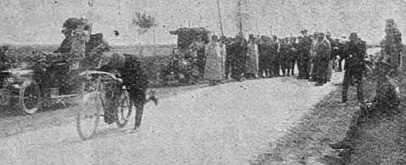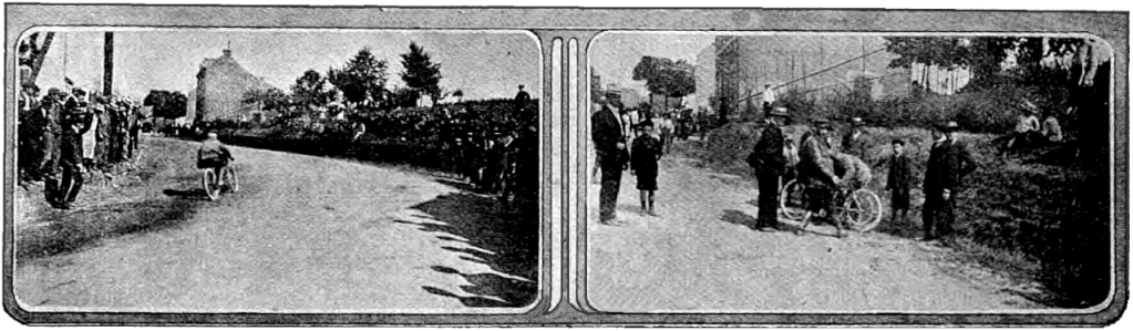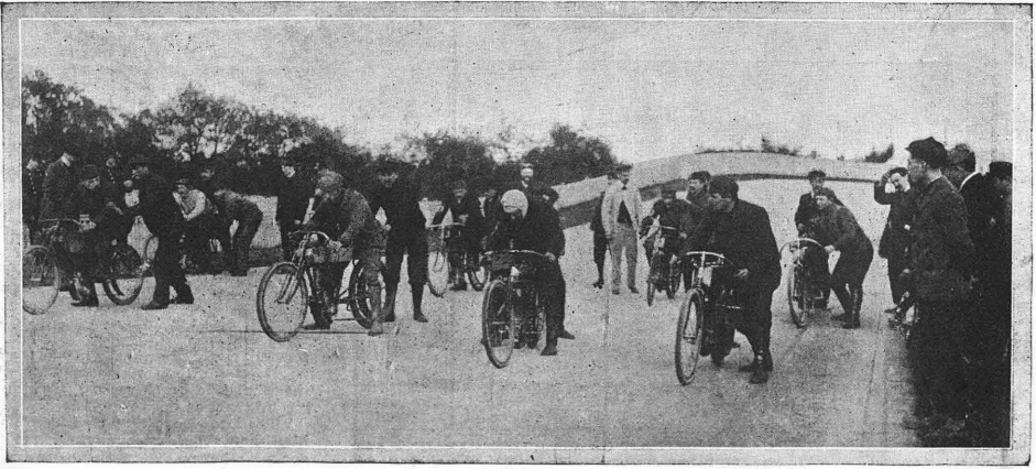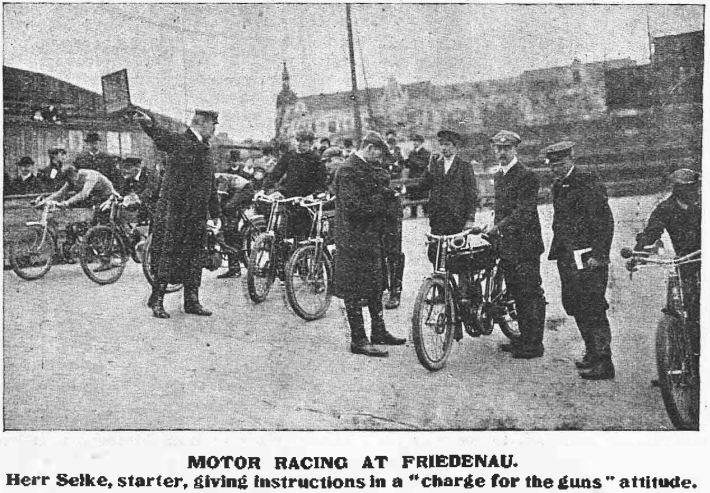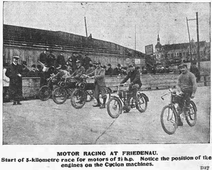 “MOTORCYCLE RACING AT FRIEDENAU. In very unfavourable weather, the German Motor Cycle Association’s programme was carried through at Friedenau on the 30th of October. Notwithstanding the conditions, the attendance ran into thousands, the spectators following the races with as much interest as the cold north wind allowed. The meet opened with the heats of a 5,000 metre race for machines of 2½hp. An interesting feature of this race was the Cyclon, a front-driven cycle—the sole representative of its class. Its engine and necessary accessories are fixed above the front forks—not in the front wheel, as with the Singer—transmission being by belt. In the preliminaries this make did very well—ran fast and with marked steadiness, but was quite out-distanced by the the Progresses and an Allright in the final, when Mraz and Tolksdorf (the ‘little Gordon-Bennett’ representatives) gave us an exciting bit of neck-and-neck racing, not a yard separating the two on the tape. The result was: 1st, Mraz (2.4hp Progress), 4min 28⅘sec; 2nd, Tolksdorf (2.4hp Progress), about a yard behind; 3rd, Ebstein (2.35hp Allright), 130 metres behind. In the 10,000 metre race for motors up to 3hp, Otto Lenz, a young student from Alt-Strelitz,