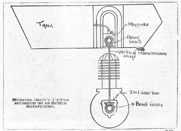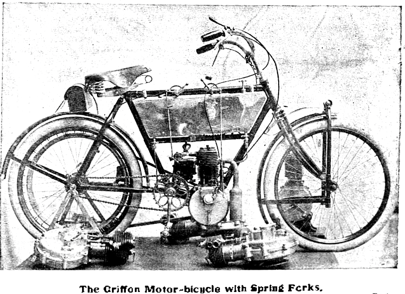 “THE GRIFFON COMPANY stage a number of machines mostly built on standard lines with V-belt transmission, and either magneto or coil ignition. All the machines have a new double-acting band brake on the rear hub. An 8hp twin-cylinder racing machine with V-belt drive is a special feature. The frames of the machines shown strike one as being unusually strong, especially the front forks, which are of the duplex type. Several spring forks are shown. The magneto is most ingeniously concealed in a compartment of the tank, and drives by a vertical shaft and bevel gear from the two-to-one gear-box.”