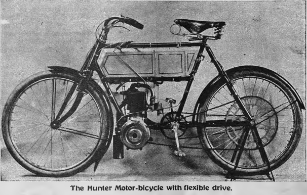 “THE HUNTER CHAIN DRIVE Motor-bicycle. The machine illustrated is made byHunter Motors, Eastdown Works, Lewisham, London, SE. The special feature of the machine is the transmission and gear system, which is fixed on the engine in place of the ordinary pulley. This gear, the makers claim, has the advantage of giving a perfectly flexible and yet positive and direct drive. Only one chain is used for the drive and thus the complication of a countershaft is avoided. The motor is mounted vertically in a special long wheelbase frame and is fitted with duplex forks. The carburetter is of the spray type and ignition by coil. The petrol tank has a large capacity. Two rim brakes are fitted.”