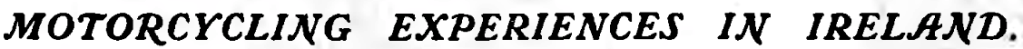 “NOT THE LEAST AMONG MANY PLEASURES permitted to man is that of remembrance, and with our memory of incidents past there is invariably the association of something tangible, the re-occurrence of which at once recalls the period it unconsciously is a part of. Thus, when recently through my bedroom window came the keen refreshing breaths of air and the welcome rays of a genial morning sun, I felt a sense of exhilaration, a stirring to impulse, and through my mind flashed memories, memories of when at such a period of another year I had my first experience of motoring. Like a first visit to Paris, or a first dance, one has a first motor ride but once—unfortunately. Well do I remember mine! The germs of the ‘motor fever’ I developed were first caught through reading our little ‘green-backed friend’, and very soon afterwards was a selection made and a mount purchased. After waiting a short time the machine arrived. Then, mounting it on the stand, filling the tanks with oil and petrol, and with a book of directions on the table before me, I assumed the role of chief engineer (a whiff of petrol vapour at, any time recalls that evening), and, with some coaxing, off went the engine. How it buzzed and hummed! It seemed to me then, and still does so, almost incredible that upwards of 1,200 separate and distinct volumes of gas should be inducted, compressed, ignited and exhausted in the short space of one minute; yet such was, and is, the case. It was no wonder that I felt a sense of admiration not unmixed with awe as I watched and controlled the movements of the rapidly revolving little engine that was to propel me so faithfully and well afterward. The consciousness of possession had pleasures of its own, and all the little taps, levers, electric and other fittings added not a little to this feeling. It is the small things of life that somehow attract us most. The next morning, and without any previous experience, I essayed to ride alone, and not without some slight trepidation mounted, pedalled briskly, and though I soon heard the engine go ‘pop-pop-pop’, it was not until I had gone 20 or 30 yards further that I realised I was actually being carried along without any effort of my own. The psychological moment had come. I was being whirled through the air, slowly at first, but with rapidly increasing speed, the vibrations of the machine caused by the engine explosions acting as a stimulant and producing a feeling of elation, for then at least the sordid cares of life were non-existent. On I went, lifting the switch lever for a moment every 50 yards or so until the confidence of control was felt; then gradually advancing the spark and opening the throttle valve the speed increased; 10—20—30 miles per hour was reached—the last seemed 60. Off flew my cap, it soared to earth. What mattered a dozen caps? Let it lie, it belonged to earth. Onward I sped by winding country roads, tears trickling down my cheeks, nerves at high tension, approaching curves with both hands ready on the brake levers, now taking hills upward at a speed that seemed marvellous, now rushing down the other side at break-neck rate. Intoxicated! And all the time more speed, faster, faster was the desire. Surely something must happen, something break? But no, switching off current my engine stopped, and in a few seconds I stood once more on terra firma, my heart beating wildly. Could such a ride be repeated ? It could, and was, and as I sped homeward I knew that I lived; hitherto I had merely existed. Since then I have had many exciting rides, but none more so than my first. The feeling when riding at high speeds is delicious for the reason that a motor-bicycle has a personality, so to speak, of its own; it is part of you, and you are part of it. In driving a car this feeling is quite absent, it is grand to go through out of the way and hitherto unexplored regions, unexplored either because of the distance from home or the hilly contour of the country: the exhilaration of spirits produced as one skims over roads, whizzing by hedges and meadows, up hill and down dale: the fragrance of growing vegetation, hawthorn blossom or honeysuckle on the olfactory organs, exercises a subtle charm and combines to form a new sensation which cannot well be described. This article being written principally with a view to interest prospective or novice motorcyclists, I refrain from dealing with or criticising technical subjects. The various correspondents in ‘OPV’* discuss very thoroughly the questions as to the merits of various types of machines, methods of power transmission, and the virtues of carburetters, etc, but I feel bound nevertheless, while not antagonistic to the ideas of those who favour the higher-powered and heavier machines now being so much used, to express an opinion in favour of a machine comparatively light and not exceeding 2hp. Less than this size, a 1¾hp well-known chain-driven machine has carried me about easily, and up any hill (including the famous Ballybannon hill at Castlewellan) without trouble, and 1 have also used it for trailer work, doing at times a 70-mile run. There is no doubt, whatever, to my mind, that a saving is effected in the lighter made and lower-powered machines in cost of maintenance of tyres and running, quite apart from their being cheaper in price than others in the first instance, and more easily handled in bringing in or out of premises. The latter point is a consideration. The question of the reliability of motorcycles is one in which much misconception on the part of the non-riding public exists. I am asked continually, ‘Is not the motorcycle very liable to break-downs?’ My reply invariably is, ‘No’; but I cannot always get people to believe this. To them a stoppage, for any cause whatever, whether only to clean a fouled sparking plug, or refix a loosened terminal, is a ‘breakdown’. And the wrong impression is not altogether unwarranted, for they have good cause