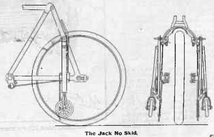 “THE JACK NO SKID. This quaint title has been given by Mr WH Hayes to the combined non-skidding device and jack, which he has considerably improved since we first described it some 18 months ago. As now constructed it can be fitted to any type of motor-bicycle. Normally the two small rubber-tyred wheels are carried upon the arms, as shown in the illustration; when a greasy stretch of road has to be negotiated the simple act of back-pedalling lowers the side wheels into any desired position, either right on the ground or just clear. Forward pedalling instantly raises the wheels to what may be termed the neutral position. For use as a jack, the arms carrying the wheels can be lowered independently by means of an instantaneous ratchet, and this independence is useful when a machine has to stand upon a sloping surface. Mr. Hayes gave us an illustration last week of the capabilities of his non-skid upon the greasy stone setts in Rosebery Avenue, and manipulated his machine in a manner which appeared to be absolutely courting danger: he turned sharp around at a good pace at any point we wished, stopped and started, and wobbled the front wheel purposely, without the slightest sign of skidding. Mr. Hayes offers £10 to anyone who will discover a road surface which will cause him to skid or slip over, and searchers after the ‘tenner’ will find him at 532, Oxford Street, W. We think the device a really excellent one, and deserving trial by those who fear greasy roads.”