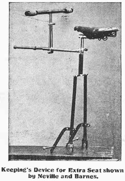 “AMONGST THE MACHINES shown by Rene Gillet, 10, Villa Collet, Paris, is a fore-carriage having a very large clutch arranged on the rear wheel. The belt rim is spoked separately to a flanged drum, which can be made to engage with a cone connected to the wheel flanges. Amongst the bicycles the novel features are an improved band brake and a tank of very large capacity, obtained by modifying the frame design. The diagonal tube is carried much further back than usual.”