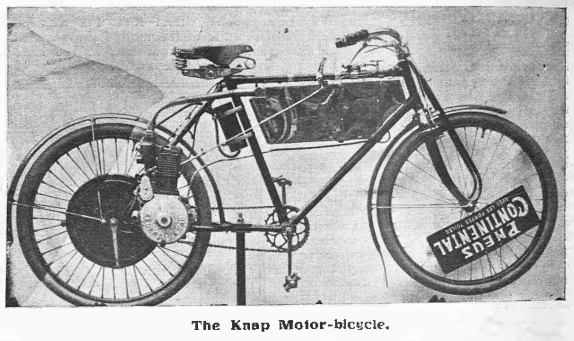 “GEORGIA KNAP, TROYES, stages a series of Knap motorcyclettes built on the direct-drive principle through spur gearing. The engine is mounted on one side of the back wheel by a clamp on the stays. A small spur gear on the engine shaft engages into a large spur gear connected to the back wheel hub. This gear is in two parts, an outer and inner ring being connected by springs to render the drive less harsh. A gear-case encloses the spur wheels. The engine is the usual pattern, but none of the models have silencers proper, the exhaust valve box being enlarged and perforated. A rather obsolete type of surface carburetter is used, connecting to the engine by a flexible metal tube. A novelty shown on one machine is a spring fork. The main fork is curved rather sharply at the end, and carries a pair of rockers to the centre of which the wheel axle is fitted. The free end of the rocker moves against a spiral supported against a stop brazed to the main fork, and there is also an additional spring above the latter, acting against a stop on the rod, which is fixed to the end of the rocker. It is, in fact, like two springs acting in opposite directions. It looks an effective device. The Knap machines are made in several powers from 1½hp to 2¾hp.”