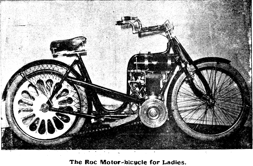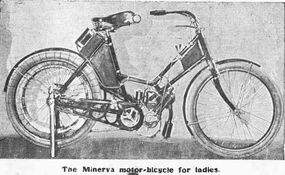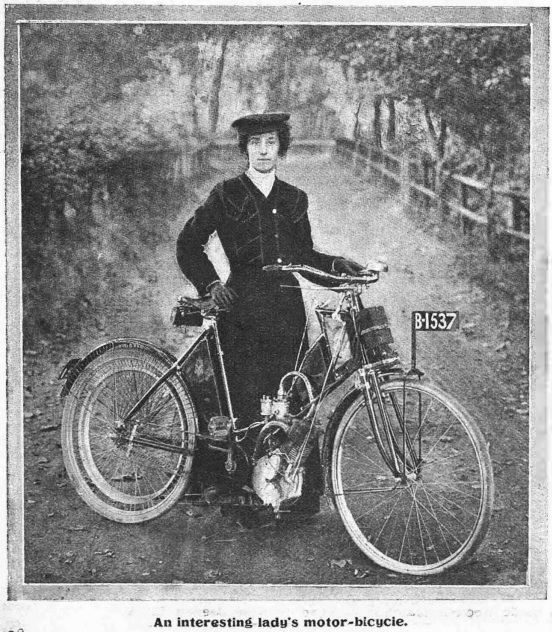 “A LADY’S MOTOR-BICYCLE. The illustration shows a motorcycle which a reader of ‘The Motor’ has recently made for his wife. The motor is a 2hp Minerva, driven by a twisted belt, which is guarded from catching the dress by a frame covered with ½in wire netting. The gear case is made the same way, and both can be taken off in five minutes. The petrol tank is between the down tube and back wheel ; the accumulator next the head tube in front; and a tank containing oil a little below it. The coil and trembler are fixed to the front forks. As the motor stands, it weighs 971b, and a speed of 30mph can easily be got out of it. Our correspondent’s wife has been riding it since last August, and wherever she goes the machine is the general topic of conversation, and everyone says it is the first they have seen.”