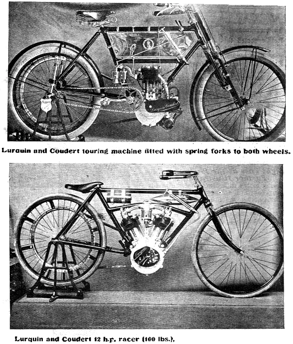 “LURQUIN AND COUDERT, 19, Rue Planchette, Paris, show a series of well-finished mounts of 3hp. The transmission is by V-section belt, and the ignition by high tension magneto with gearing cased in. The engine has mechanical valves, and a special cut-out is fixed on the exhaust. Control is effected by levers on the handlebar. The front forks have spring suspension, the arrangement consisting of a duplicate fork pivoted on the main fork and acting against a spring in a tube mounted in front of the steering column.”
