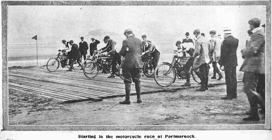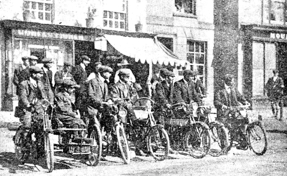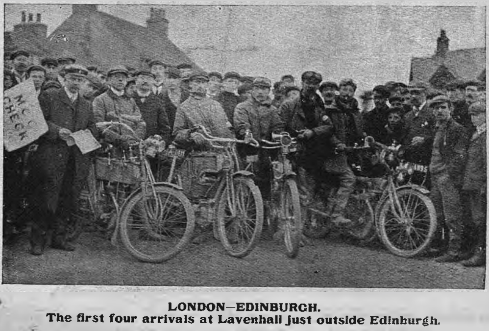 “THE OPENING RUN OF THE SEASON of the Edinburgh Motor Cycle Club should have taken place on Saturday, the 9th inst, to Peebles, but owing to the violent storm of a mixture of snow, sleet, hail, rain and wind, the run had to be abandoned, to the great disappointment of the members who had been looking forward to a pleasant outing. Saturday was just about as wild and unpropitious a day for riding as can be imagined, and reminded one more of a day in mid-winter rather than in spring. The club, we are informed, promises to be much stronger numerically this year, and the members are very enthusiastic. They are only longing for the April showers to cease. Linlithgow was the destination of the club on Saturday last, and other places to be visited in the course of this month, May and June are West Linton, West Calder, Haddington, Bathgate, Gullane, and North Berwick, Lauder, Falkirk, Innerleithen, Dunbar, and Galashiels.”