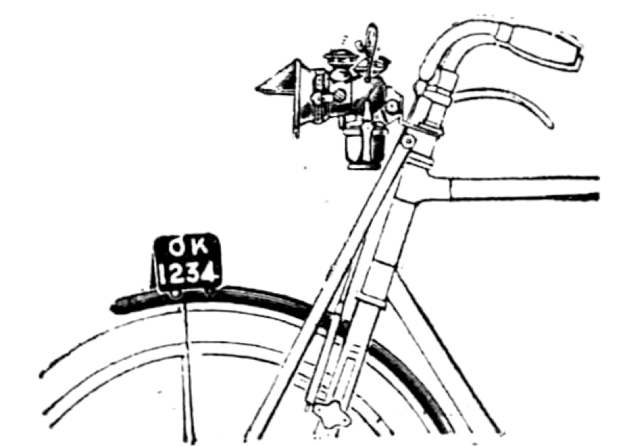 “A CORRESPONDENT WRITES ME somewhat plaintively about the numbering conundrum. The nature of the mystic symbol which he is to bear has been communicated to him, but he cannot decide upon the best means of fixing the plates, and in this respect I can sympathise most heartily with him, because, although I have known my number for some weeks, it is only to-day (as I write) that I have given an order for a set of plates, and even now I am not thoroughly satisfied that, with so many busy brains at work, some better schemes will not be put forward. I think, if I were not likely to be wanting to use a motorcycle for a month or two, I should wait, sitting on the fence as it were, applying, however, for the number before the figures got too high. In London, for instance, the numbers a week or two ago had nearly reached the limit of 999, and after that London will have to take on a double index letter instead of the simple A at present being issued. I have decided upon plates of stout tin, stove-enamelled, with the numbers painted on. Made in this way they are lighter than enamelled iron, and in the case of a blow they will bend, and the surface will not fracture as enamel will. The rear one I am having clipped on the rear of the luggage carrier, which will allow it to present a vertical surface, will carry it in a7 place where it i can be firmly and rigidly attached, and if the machine should happen to be stopped at the wayside, resting on the stand, the number will be down out of sight. This latter may be a minor point, or it may be important, and if it is important the front number can easily be concealed in some seemingly careless way. I think that a plate attached to the rear mudguard would be somewhat in the way, and certainly it would be liable to sustain damage, whilst on the backstays there is insufficient room with a brake and a toolbag and, as the plate must be quite upright, it would have to stand away from the stays. The front plate is equally awkward to deal with, but I propose to have a couple of clips riveted at the back to enable it to be attached to the twin tubes of the steering head, and I shall have this a square plate, whereas the rear one can be oblong. Night illumination is a terrible nuisance, and I can foresee a lot of trouble arising from the Local Government Board’s regulation. I should not mind adopting the plate which projects from the lamp, a system which I know from experiment to be quite satisfactory, provided the plate be kept perfectly flat and upright and at right angles to the lens.” ‘Cyclomot’