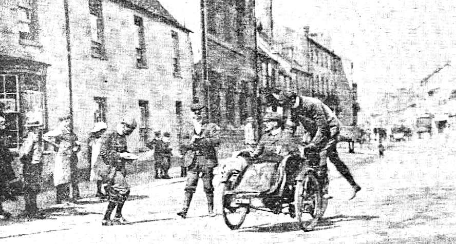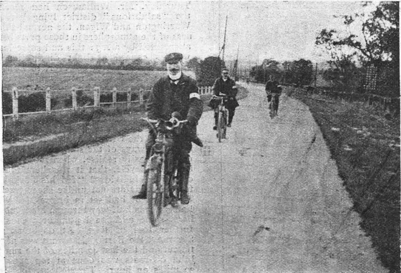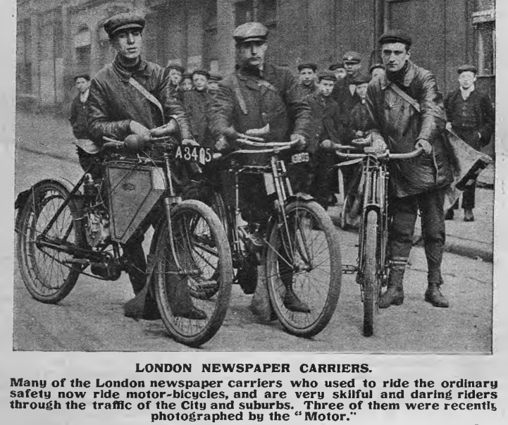 “The first London newspaper to employ motor cycle riders was the Evening News The first rider was Walter Blake, and so successful was the experiment that he now has four comrades. Mr Blake has had only three roadside stops in 12 months’ riding—one side-slip and two punctures.”