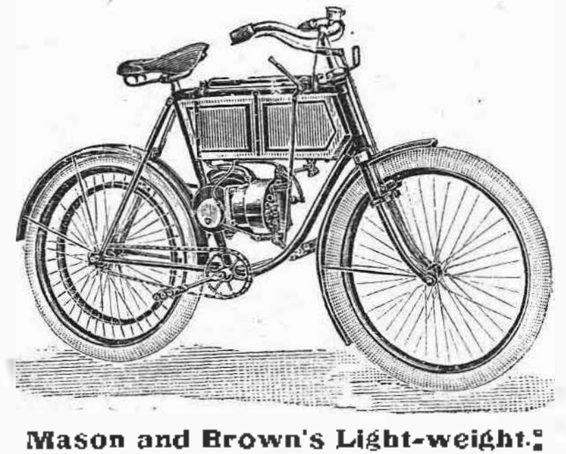 “MASON & BROWN, Rutland Street, Leicester, show some interesting electrical accessories, including the well-known M&B two-way handle-bar switch, ammeters, voltmeters, plugs, contact breakers, test lamps, etc. A new accumulator shown is made on good principles, being well protected from short circuits. The Spalding belt shown is specially made to bend easily round the pulley, the under layer being made in sections. This belt comes out at a remarkably cheap rate.”
