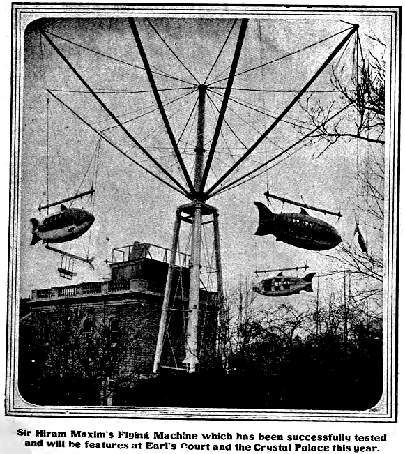 “FLYING FOR EVERYBODY. It is not possible for mankind to take generally to aerial navigation in the present condition of that interesting pastime, but Sir Hiram Maxim’s captive flying machine will make it possible for thousands to have a foretaste of the locomotion of future generations. The safety of the apparatus was recently demonstrated in the grounds of Thurlow Park, Norwood, and flying machines, as depicted here, will be in full flight at Earl’s Court and the Crystal Palace during the summer months. The cars are made to resemble fishes, and they whirl through the air fifty feet above the ground at any speed between thirty-five and sixty-five miles per hour. At the trial the latter speed was almost attained and enjoyed by the venturesome visitors.”