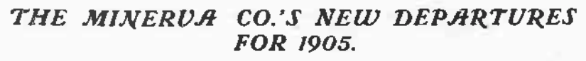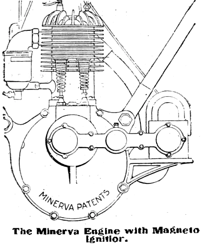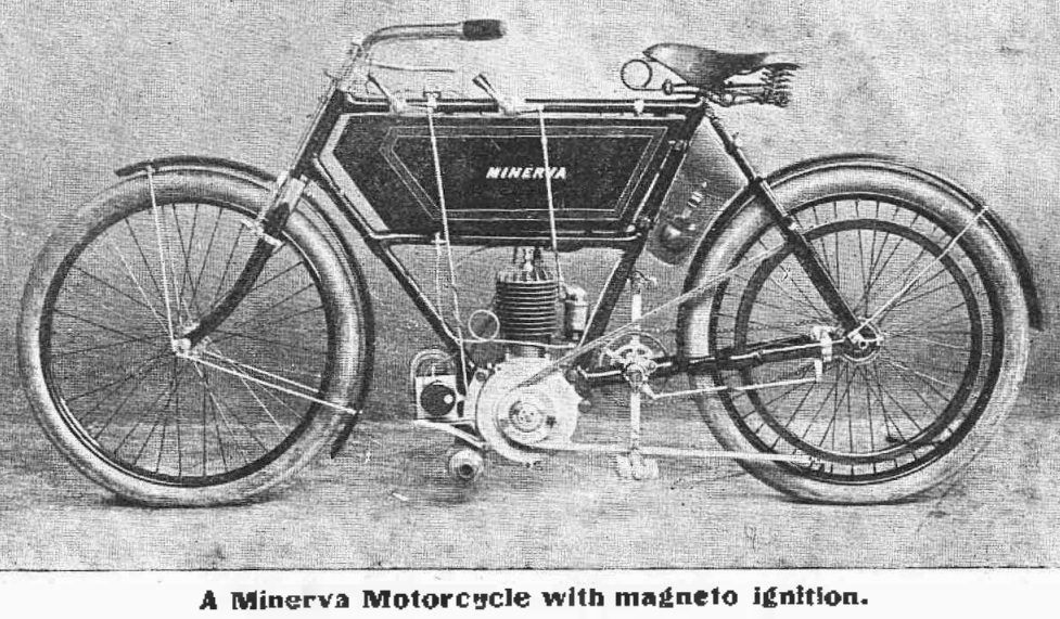 “MINERVA MOTORS, of Antwerp, exhibit a very wide range of their productions, in which their celebrated motorbicycles stand out prominently. Perhaps the most interesting in this category is the 3½hp model fitted with magneto ignition, the very appearance of which denotes great speed abilities. The engine, which is fitted vertically into a strongly-built cradle, has mechanically operated valves, and the other well-known Minerva features. A Longuemare carburetter sprays the petrol, and the new double-eccentric rocking bar drives the magneto. The machine is amply provided with brakes, there being a back-pedalling brake and another acting on the belt rim. The spring forks are retained, and the head is strengthened by twin stays. Long handle-bars are fitted, and the machine (which is built entirely on the well-known Minerva lines with which our readers are thoroughly acquainted) cannot fail to maintain the reputation of this important firm. The new 6hp twin-cylinder engine is also shown.”