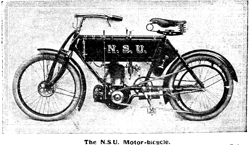 “THE NSU CO HAVE a fine exhibit…The fore-carriages on this stand are about the best designed in the show. A light pattern racing machine is, however, a new feature. This has the Eisemann magneto ignition.”