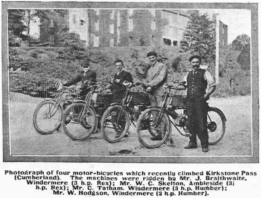“TRACED THROUGH ‘THE MOTOR’. Mr TH Scott, of Carlisle, writes: ‘I herewith enclose a snapshot of a Humber motorcyclist I met in the Lake District last Whitsuntide, when on a cycle run round Thirlmere. He towed me a mile or two towards Keswick and then returned to Windermere (where he had come from). It did not strike me till after I left him that I did not know his name. Some time afterwards I noticed a query in ‘The Motor’ on some accumulator difficulty from a Mr Hodson, 2¾hp Standard Humber, Windermere, and thought he must surely be the motorist I had snapped on the Thirlmere road, but I had no actual proof. On returning from the recent National and Stanley Shows I met a cycle agent who turned out to be the actual one who had sold the 2¾hp Coventry Humber, and the name of the owner was Mr Hodson, Windermere, as I had correctly surmised. The agent was Mr Braithwaite, Windermere. I hope you will accept the snapshot for reproduction and record my thanks to him.'”
