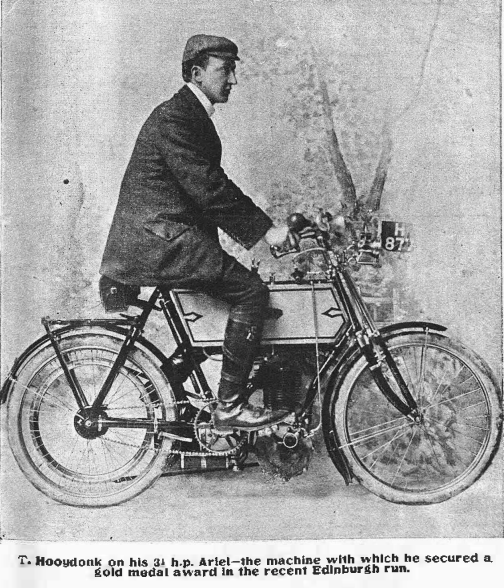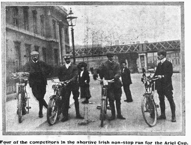 “MOTORCYCLE EFFICIENCY. I have just had an illustration of the remarkably efficient state that the motor-bicycle has reached. Through pressure of business (not lack of enthusiasm) I have not been able to use my motor the past four months. Being desirous of attending the opening run of the Motor Cycling Club to Brighton on March 12th, I took out my 2½hp Ariel, just as I put it away last October, charged the accumulator and pumped up the tyres. I fully expected to have to make some adjustments, but thought I would just try it on the stand before touching it. To my surprise it fired with the first revolution of the pedals, and that on the stale petrol. So I left well alone, and went to Brighton and back without an involuntary stop, and this on a machine that did 7,000 miles last year.