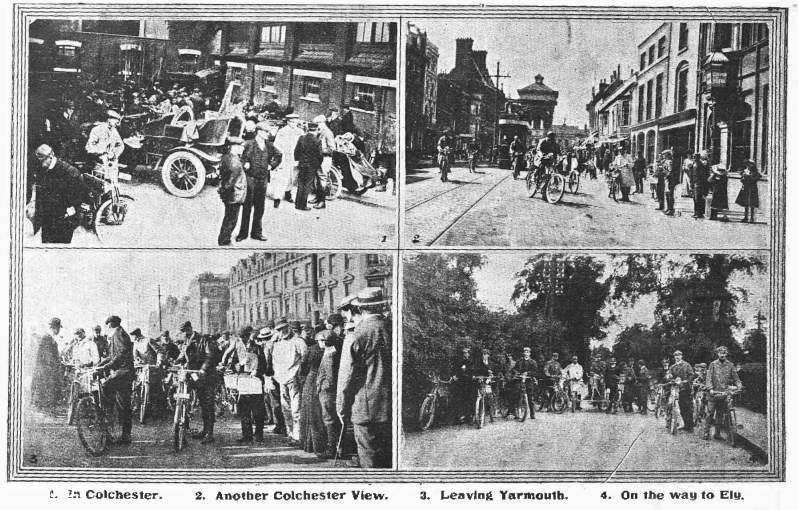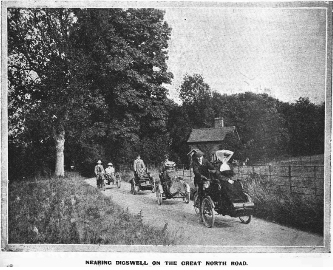 …and here’s a quartet of snapshots recording a run with les demoiselles. The third forecar in the convoy is conspicuously vacant which somehow makes the rider look more lonely than an empty pillion seat. (Digswell, which is mentioned in the original caption, is a village in Hertfordshire which dates back to the Domesday Book.)…