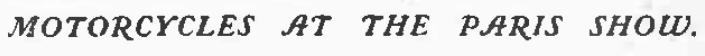 “THE MOTORCYCLE EXHIBITS this year are, if anything, more numerous than last, and many interesting features are to be found. Nearly all the firms of any note have adopted some form of spring fork for reducing vibration, and there can be no doubt that the problem of how best to get over the bugbear of vibration has received serious consideration on the part of the French makers. The devices adopted cannot, in many cases, be said to improve the appearance of the machine, but they all have the element of efficiency to a greater or less extent. In some instances both wheels are insulated by springs, which, of course, is a step in advance of having the front wheel alone insulated. Chain-driven machines are still in a great numerical inferiority to the belt-driven, nine out of ten machines having the V-section belt. Several smart ideas in free engine clutches are shown, and a larger proportion of machines than last year have magneto electric ignition of the high-tension variety, but fully 90% of machines retain the coil. In the matter of weight, it cannot be said that French makers have made special efforts to turn out a featherweight, but excessive weight is certainly not a predominating feature. The average 2½hp machine scales between 95 and 110lb, and even high-powered twin-cylinder machines of 4-6hp do not exceed 140lb in any instances. The twin-cylinder machine seems to be installing itself as a favourite type in France, for the number of these shown this year is greatly ahead of last year. Doubtless this is because a much higher average speed is possible than in England on account of the long, straight, and comparatively deserted roads in that country. The popularity of long-distance running in France has called for larger petrol tanks. Those fitted in many cases hold three gallons. In the way of brakes, the band brake seems to be the most popular type, and it is noteworthy that nearly all machines have two brakes. For general finish, the English manufacturer is far ahead of the great majority of French makers. Sound work in engine and frame and high speed seem to be the main considerations. Adjustments and control arrangements are a weak point in the French machines. In carburetters a few attempts have been made to fit automatic or self-regulating types, but on the whole the ordinary type predominates. Tri-cars are by no means numerous in the Exhibition, and it is quite evident that the English makers have practically the whole trade in this class of machine. Perhaps a dozen or so are to be found. The idea of the ‘Avant train’ came from France, and it is certainly surprising how French makers have neglected to develop it. The machines shown mainly have separate attachments, the fore-car bodies being wicker work, and the frames lacking the important main side tubes as adopted over here. Only in two or three instances have two-speed gears been adopted. In the matter of racing machines, the French are far ahead of us, as they manage to get as much as 10 and 12hp on a machine scaling under 110lb. These machines are geared very high, about 1 to 2½ being the usual ratio. An idea that seems to have been well developed by the French is that of providing an auxiliary exhaust passage to the engine. They do this by making a port near the end of the stroke, A series of baffle plates are arranged to trap any oil blown out, and the port is simply joined on to the main exhaust pipe. The tremendous speeds French racers get out of their engines certainly seems to show that there is something in this idea.”